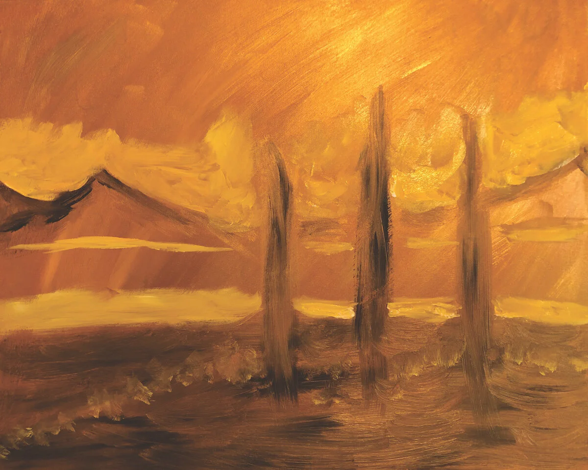 It starts with ritual and ceremony and sometimes intention to bring through supporting images for a particular issue. For example, my painting “Queendom Come” was a painting created to invoke healing between mothers and daughters and women everywhere. I sometimes start these days with a particular outline, maybe of a landscape, but then I allow the unfolding of the painting process to direct the outcome. I let go of my preconceived ideas of ‘how it should look.’