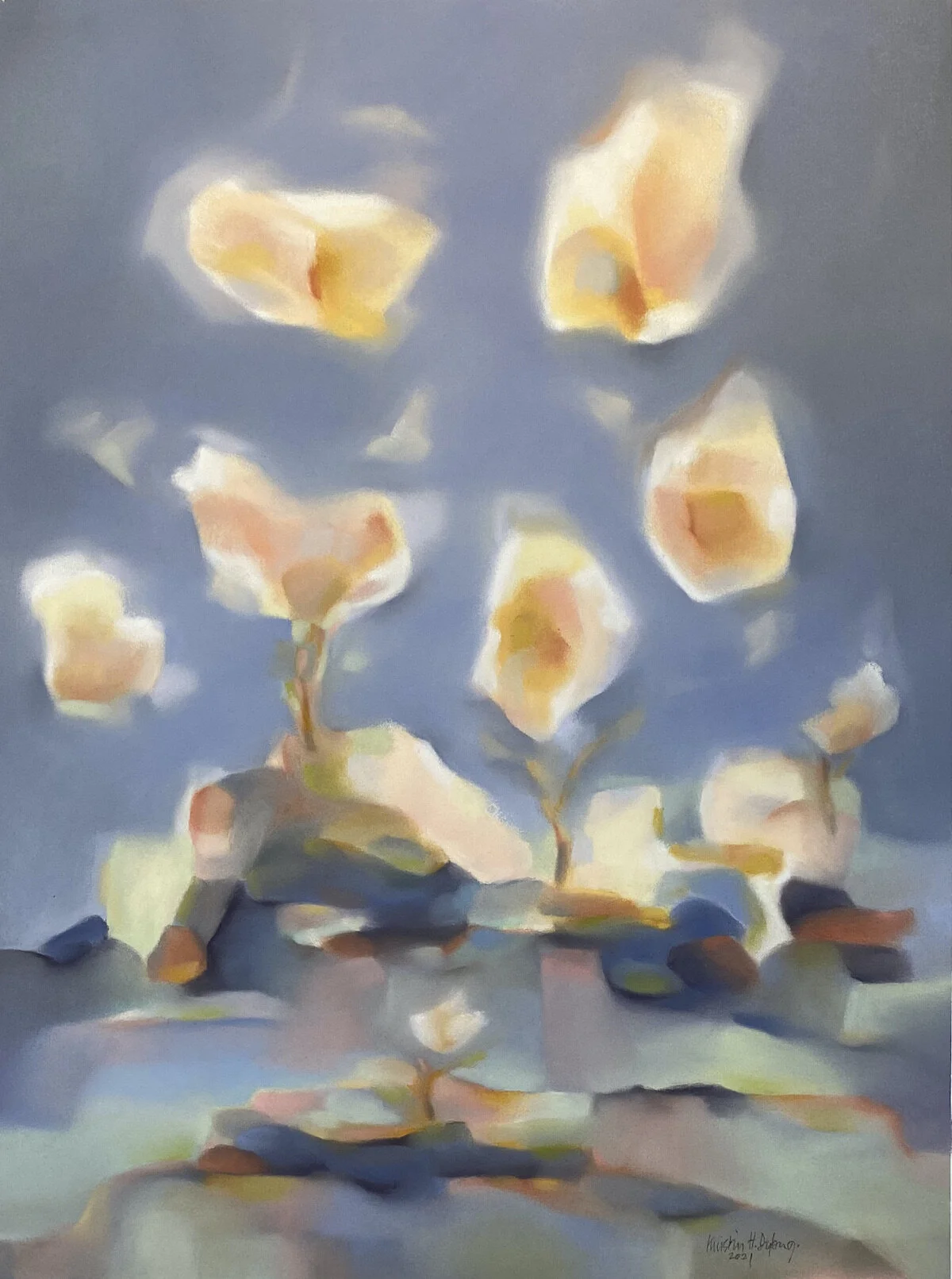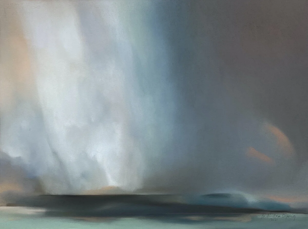 I like to weave colours into poetic colour moods using a lyrical palette of soft pastels. I find inspiration in the unpredictability, beauty and immense calm the nature here provide. I want my artwork to convey the contrasting qualities of transience and serenity, drama and variation that I experience in nature. The timelessness of these old landscapes create moments of longevity that I want in my work, reflecting the openness and simplicity. I want to give the viewer my perceptions of these lyrical landscapes and the immense power and joy that is brought by the colours as they reflects qualities of our soul that we need in our lives.