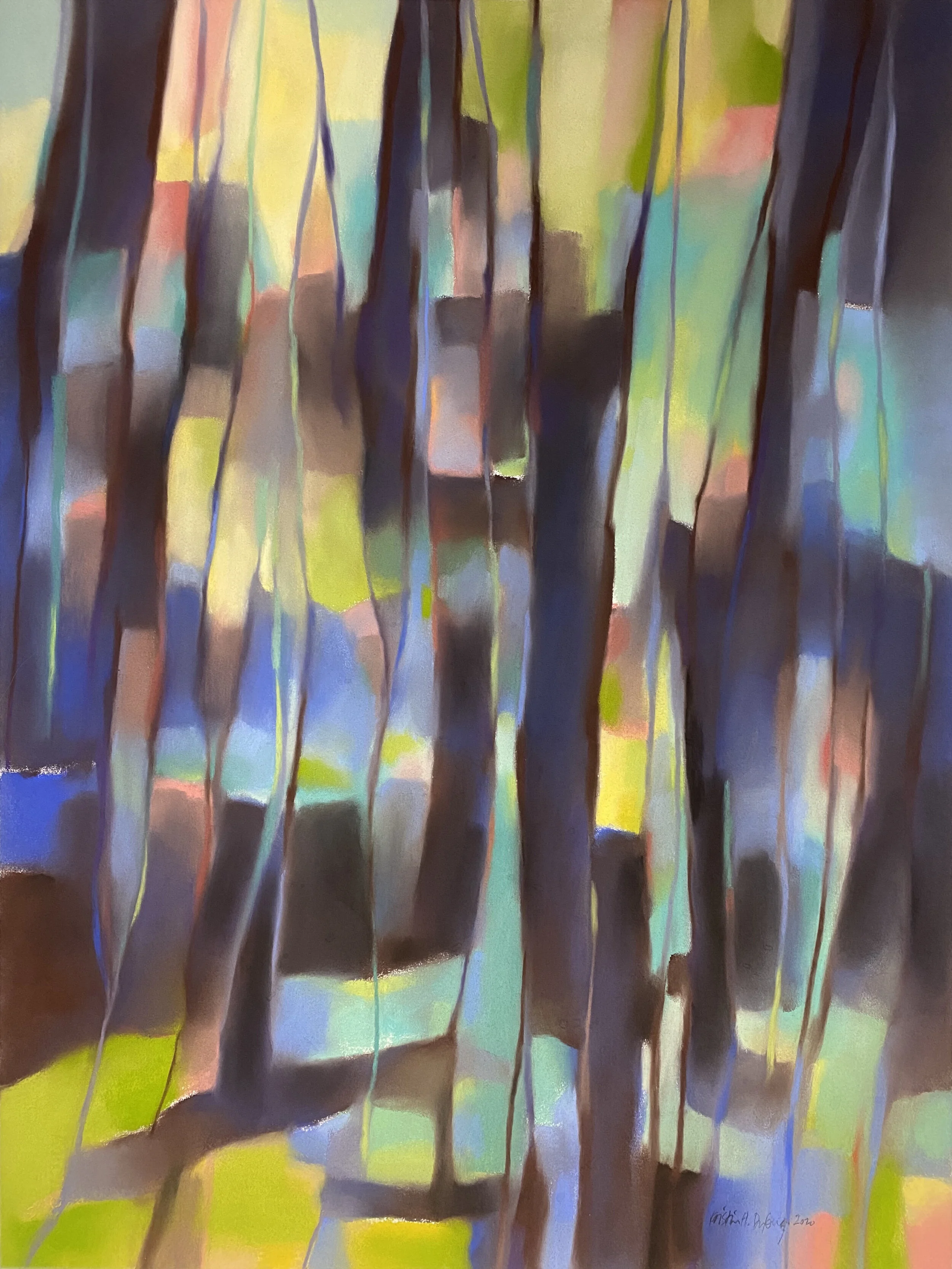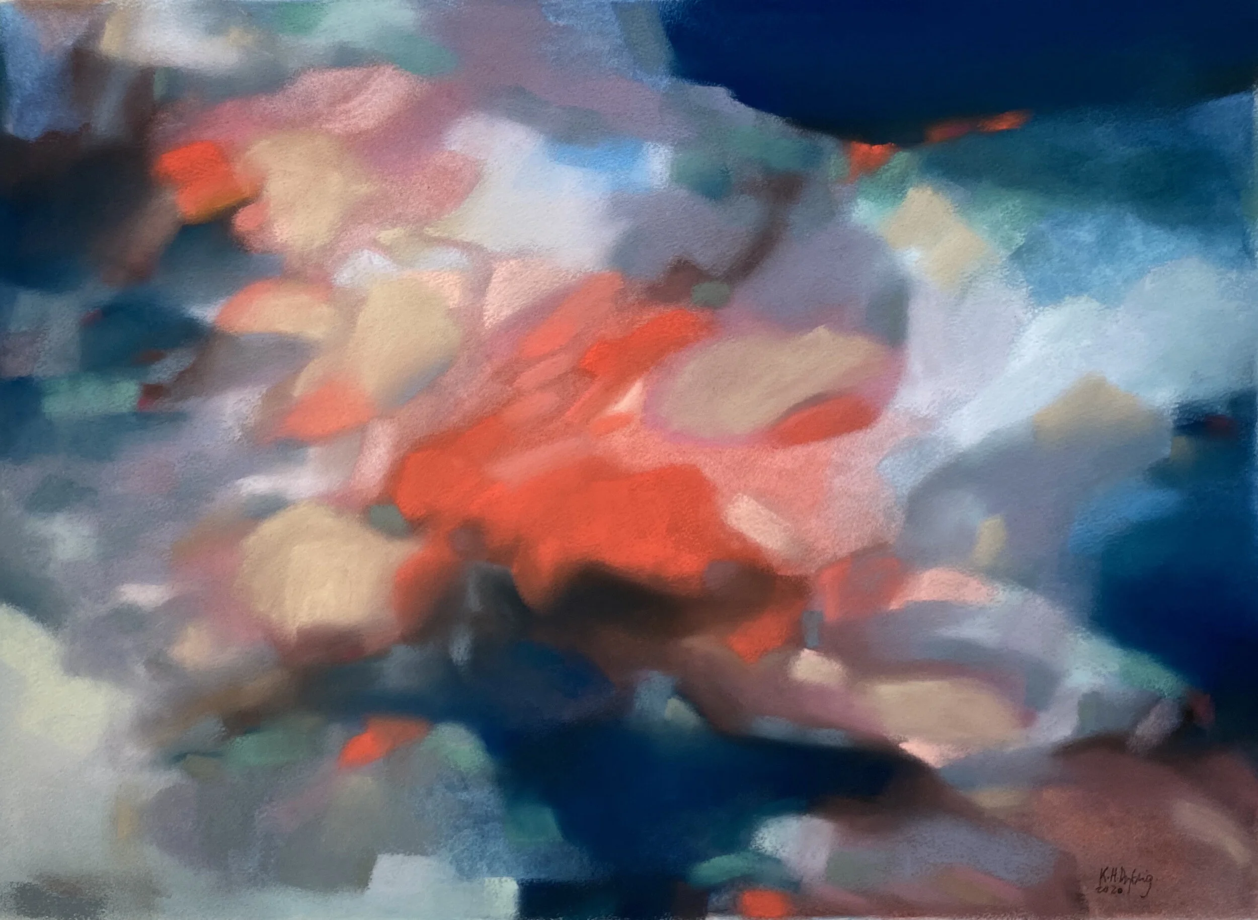 I like to weave colour into poetic colour moods using a lyrical palette of soft pastels. I live and work at the West Coast of Norway, and find inspiration in the unpredictability, greatness and immense calm in the nature here. I want my artwork to convey the contrasting qualities of transience and serenity, drama and timelessness these old landscapes provide. I want to capture the moments of longevity and let it reflect the openness and simplicity. I’m interested in how the colours appear and change and love to rework memories from walks and journeys into colourful abstractions. The intensity and inner luminosity of the soft pastels match my perception well, the slow process building layers of colour challenge me to be selective and deliberate in how I develop my composition, keeping the colour as the central focus of each artwork. I use my hands and fingers to smudge, mix and shape the velvety and matte surface, I use eraser, sandpaper, brushes and pastel pencils to add effects. The process of creating depth and sculpting the colours, adding and subtracting lasts until it has become my personal interpretation of the land, like a memory captured.