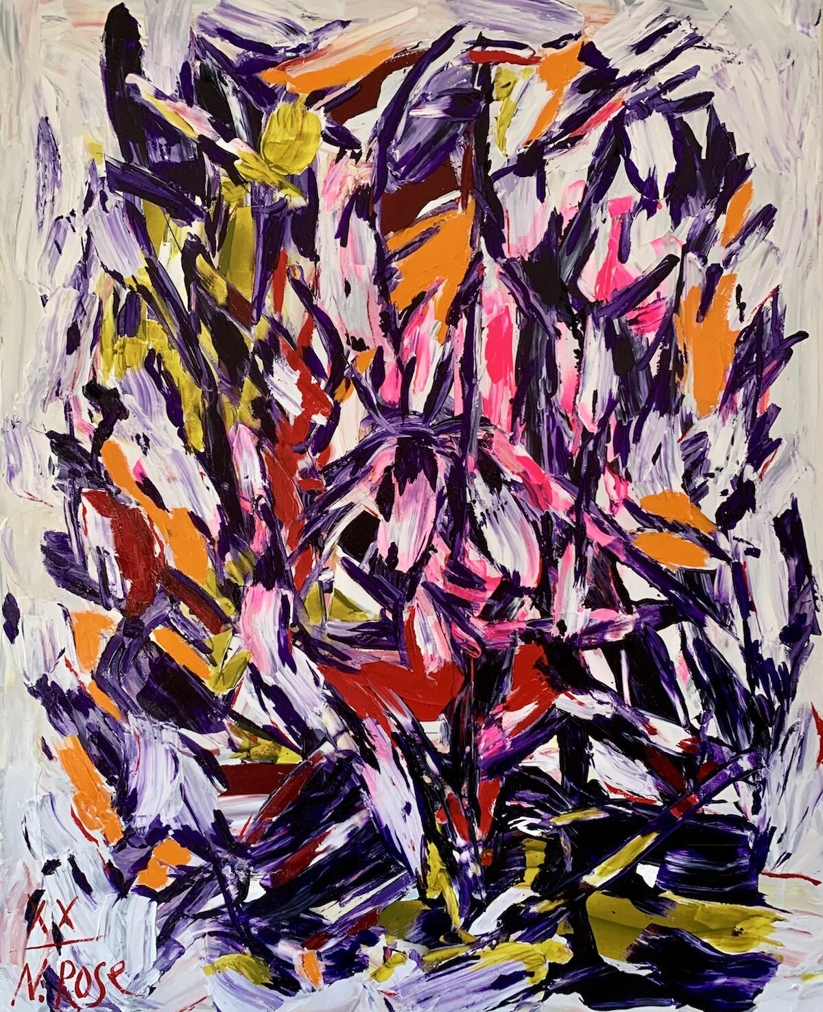 Natalia Rose is a Danish artist best known for her semi-abstract works which feature pictograph-like symbols painting with broad and heavy brushstrokes. The artist raises questions about the nature of communication and the way in which one can express abstract and conceptual ideas through colour and iconographic markings. For example, in her painting “I” (2016), the artist uses only essential strokes to spell out his name and create patterns of letters across the canvas. Born in 1953 in Stavropol, Russia she studied at the Moscow State University and later at the University of Copenhagen. In 2014 the artist held her first exhibition in Copenhagen and since in New York, Paris, Amsterdam and London. Today, her works are held in the private collections across world, in Canada, Spain, Sweden among others. Natalia Rose lives and works in Copenhagen, Denmark.