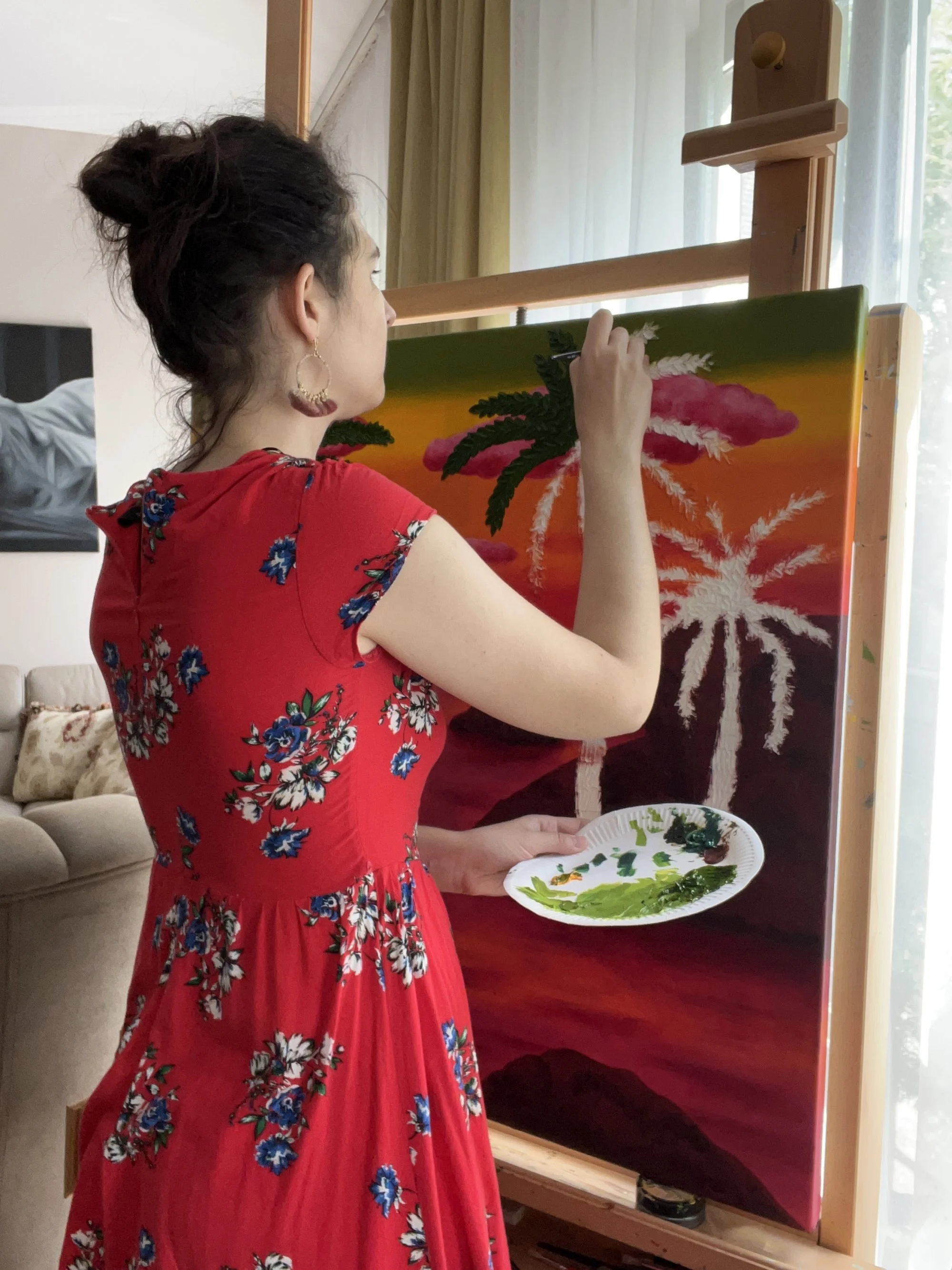 Sometimes I start with the background, sometimes with the details, but I always follow the image in my head and strive to achieve that effect on the canvas. Mathematics also teaches patience. Sometimes you make mistakes. In painting too. The most important thing is not to give up, to see where the error is, correct it, and keep painting. Thanks to this skill, I don't get frustrated when something doesn't work out. I try to improve it. If it doesn't work out one day, I try again the next day. Contrary to appearances, painting requires patience, and economics teaches that patience.