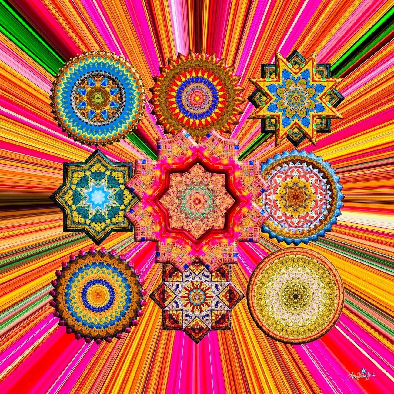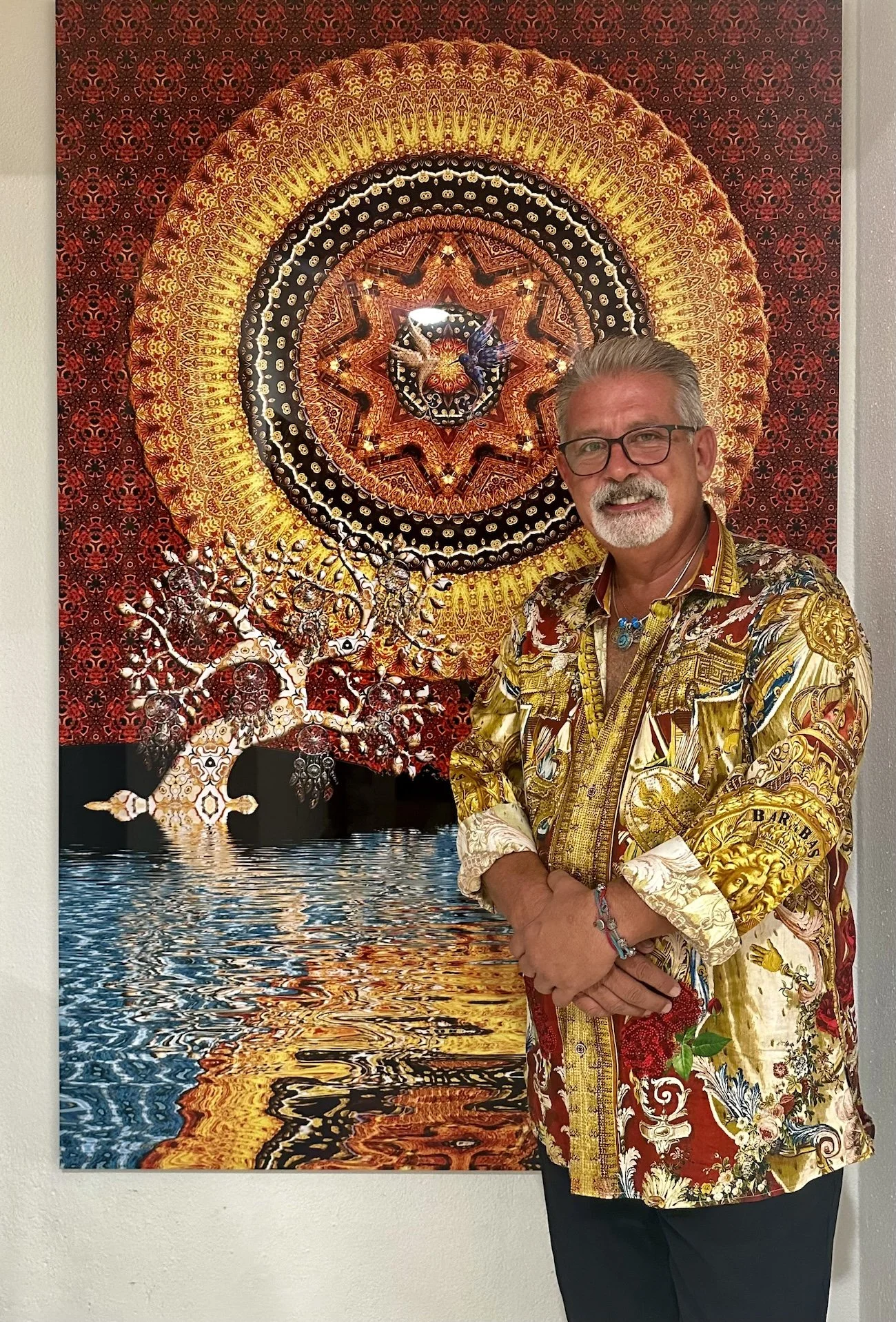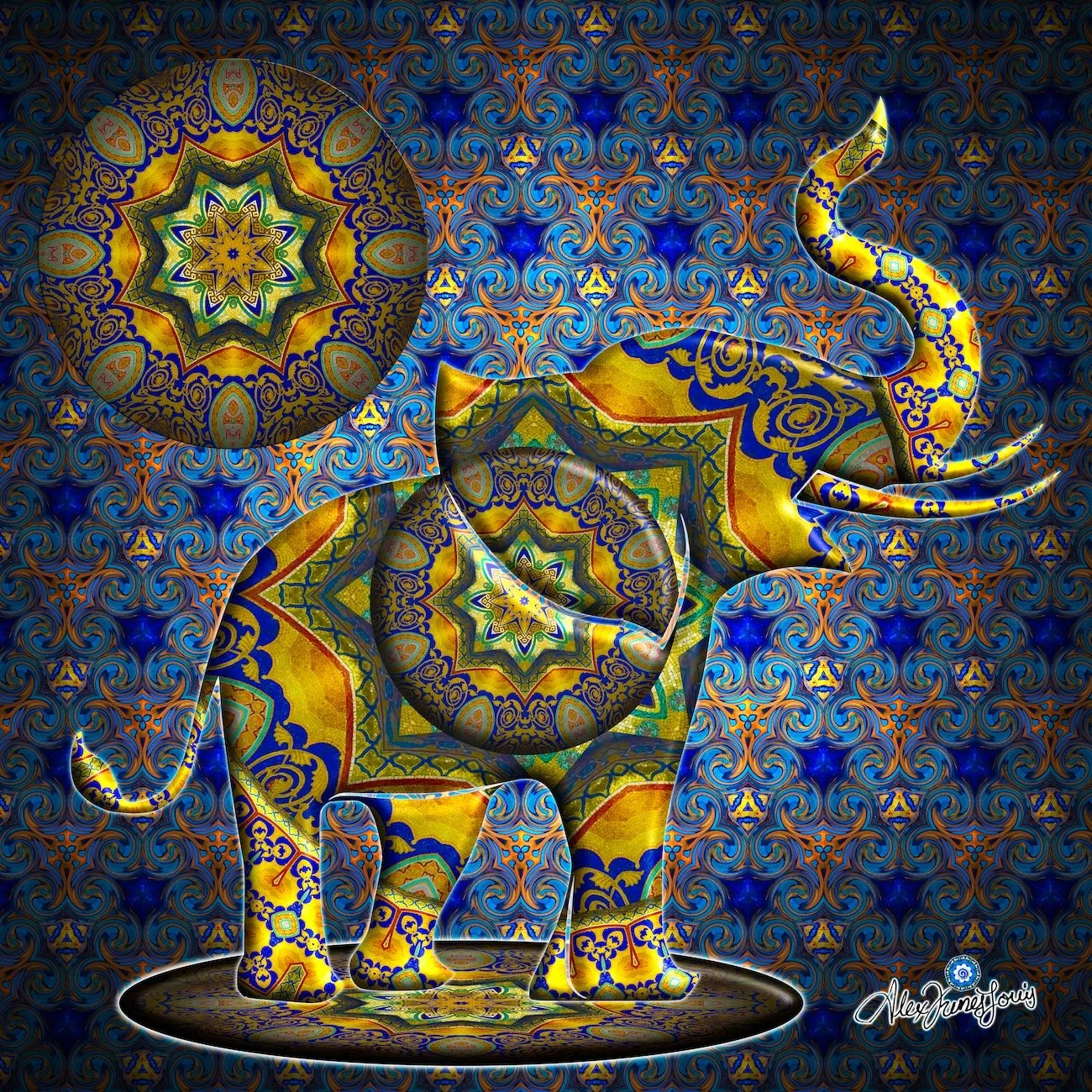 Alex, your work seamlessly integrates sacred geometry, vibrant colors and numerology with the rich visual heritage of the places you have visited. Could you elaborate on the intricate process you go through when creating a piece that fuses these various elements? Specifically, how do you decide which cultural motifs, geometric patterns, and color schemes to incorporate from each location, and what role does intuition play in this creative process?