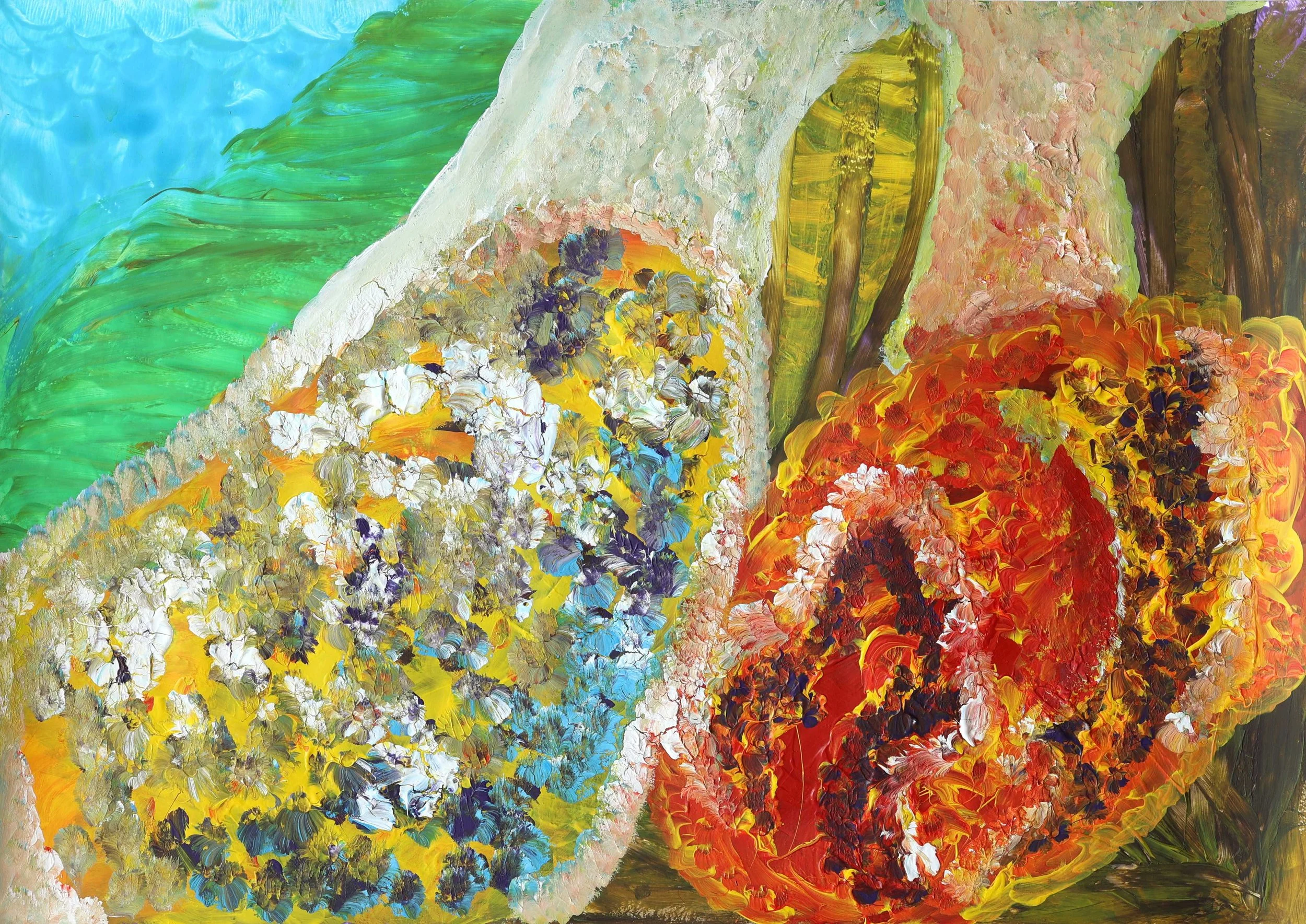 "Encapsulation", 2024, acrylic and paper, 44x64 cm.