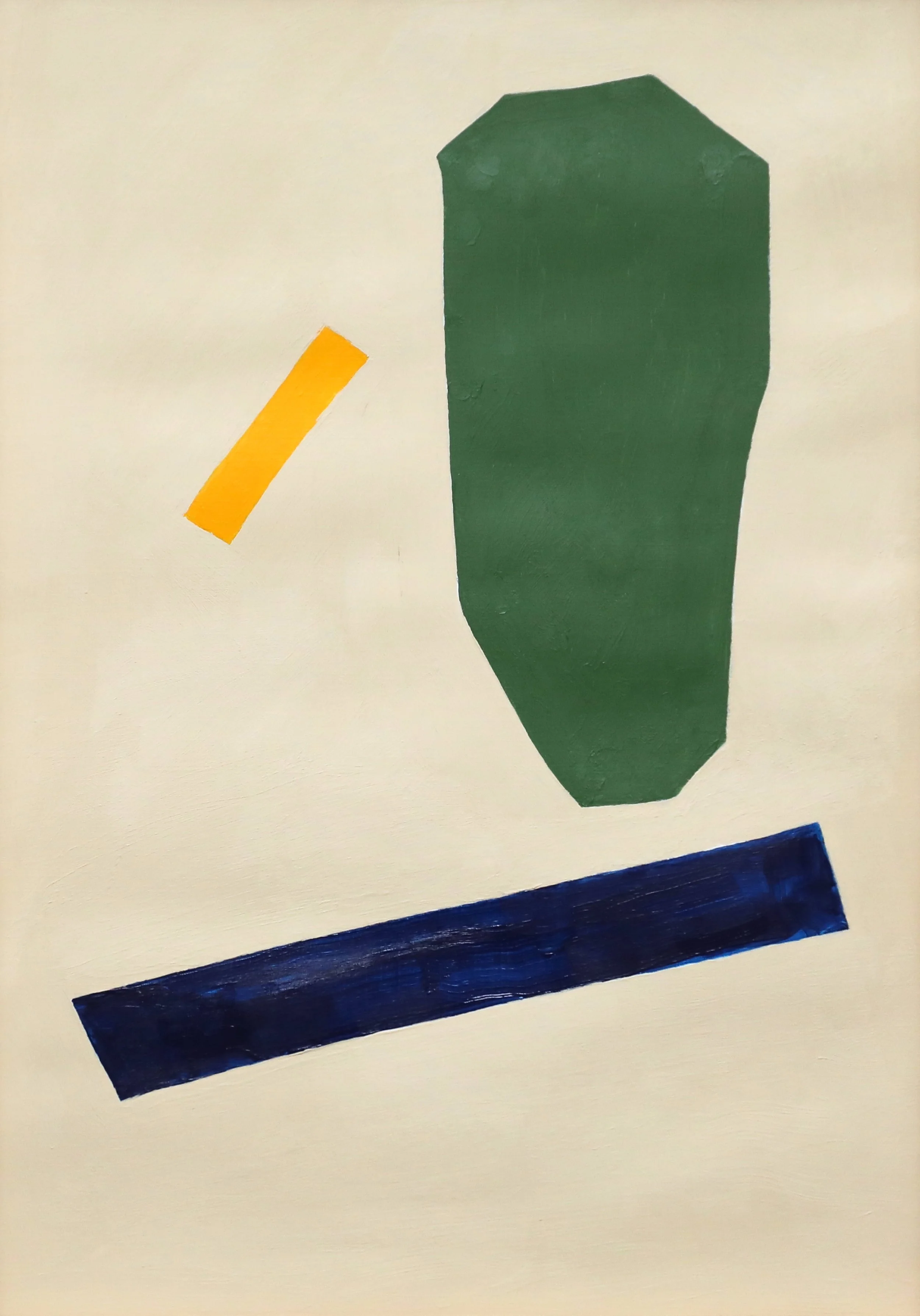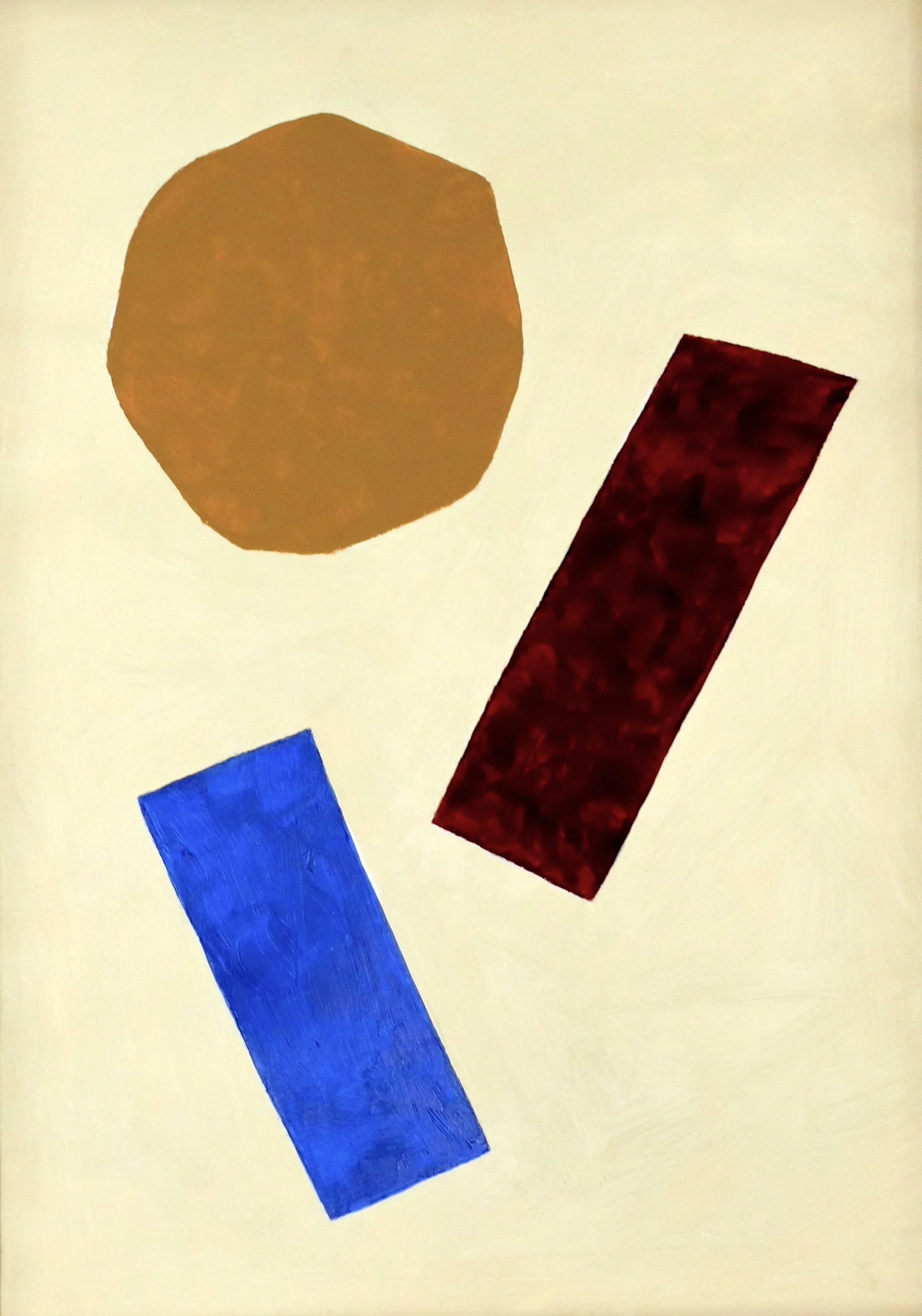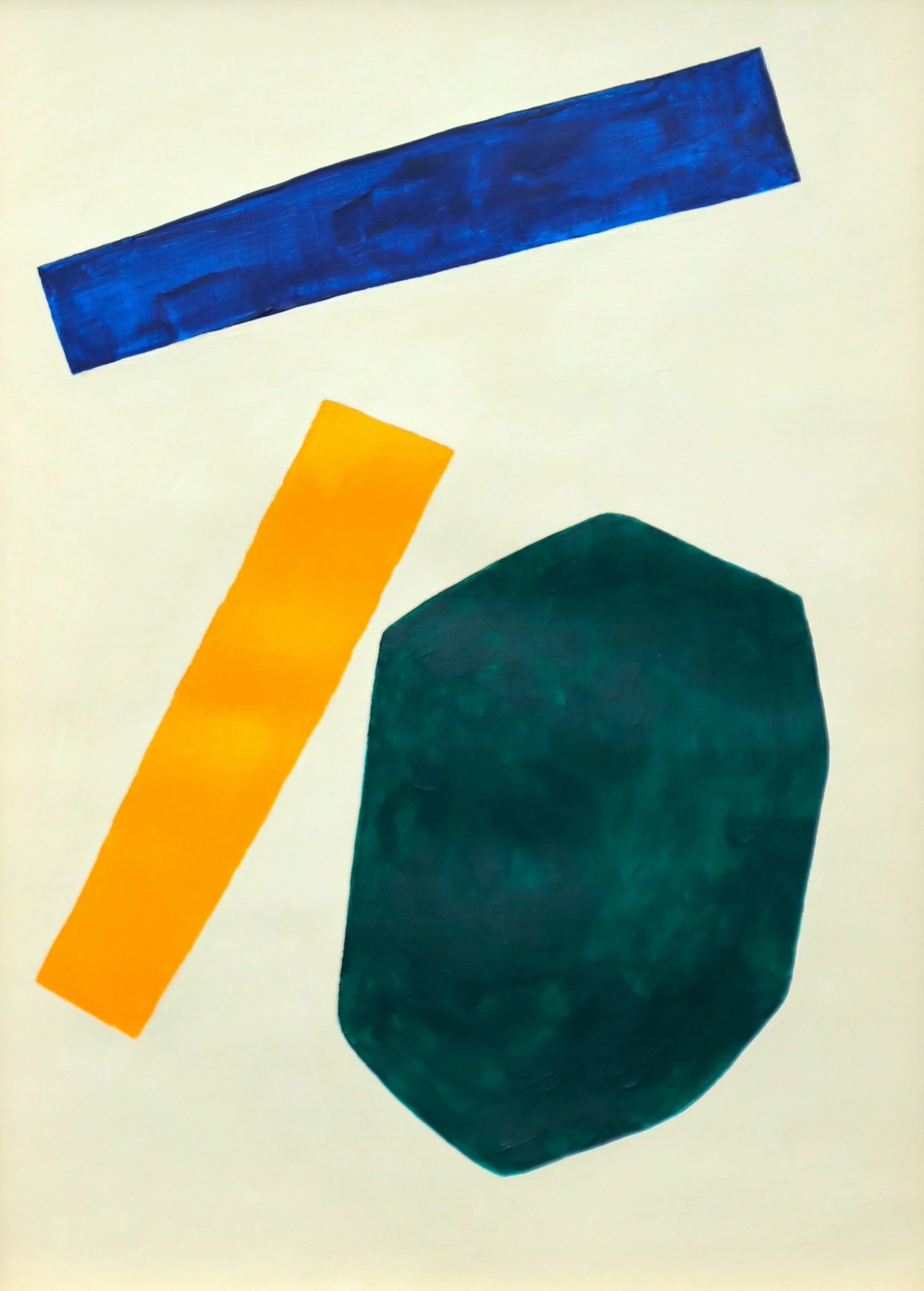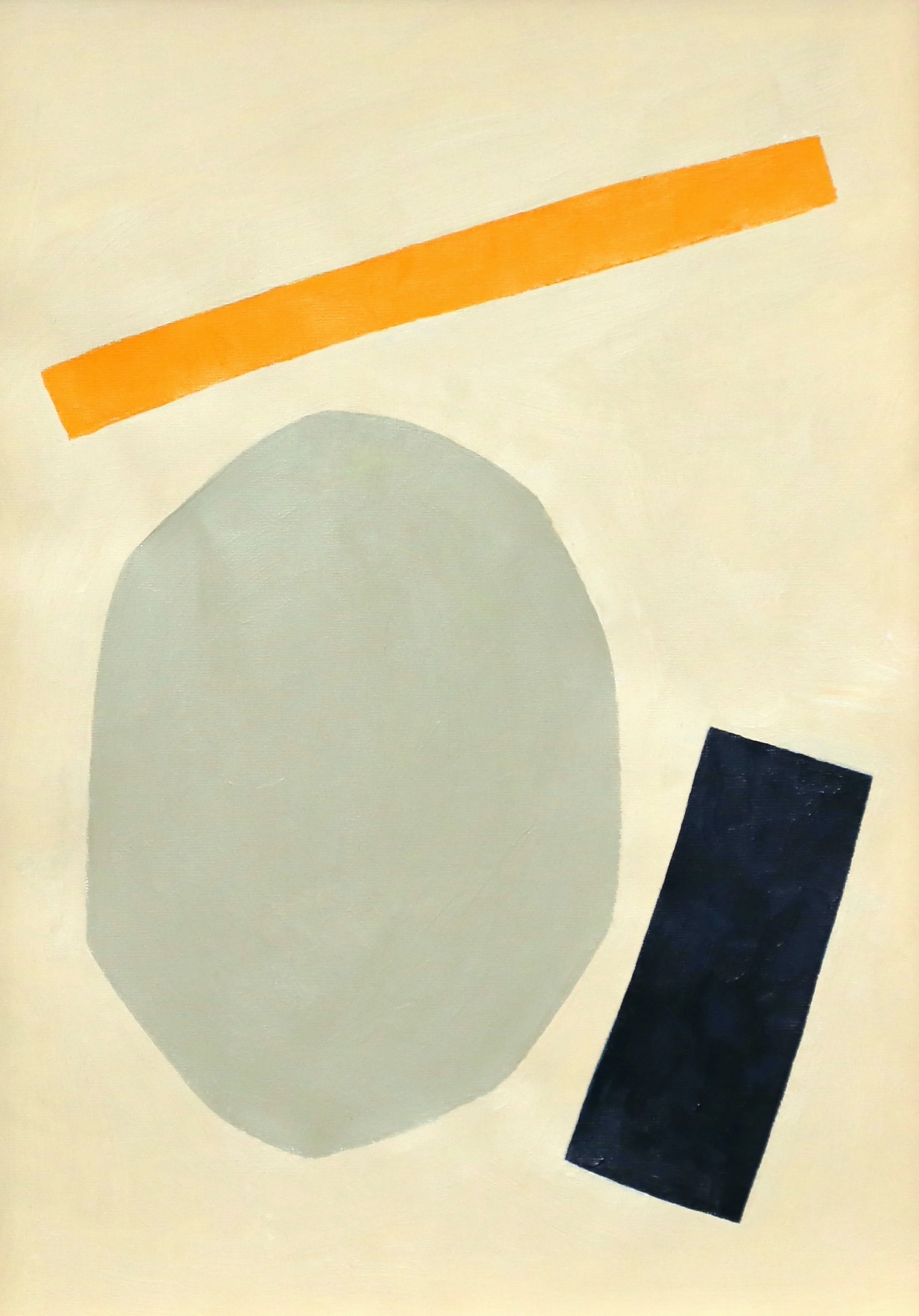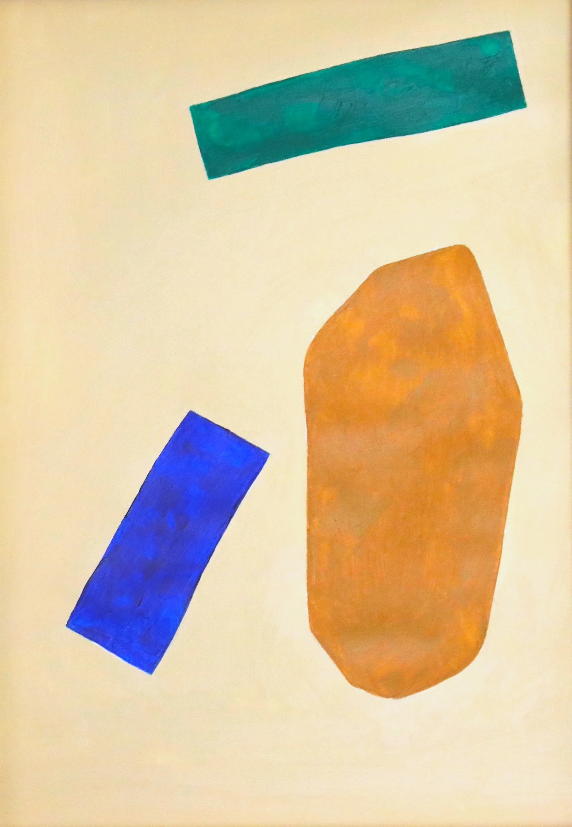 By 2025, works such as Blue ZZW and Orange H demonstrate a subtle shift. The palette becomes warmer, the forms slightly more assertive. Orange H introduces an earthy orange shape whose surface retains visible brushwork, emphasizing the hand of the artist. The two linear elements in this painting do not frame the central form so much as converse with it, creating a triangulated space that feels both stable and dynamic. The painting suggests a dialogue rather than a hierarchy.