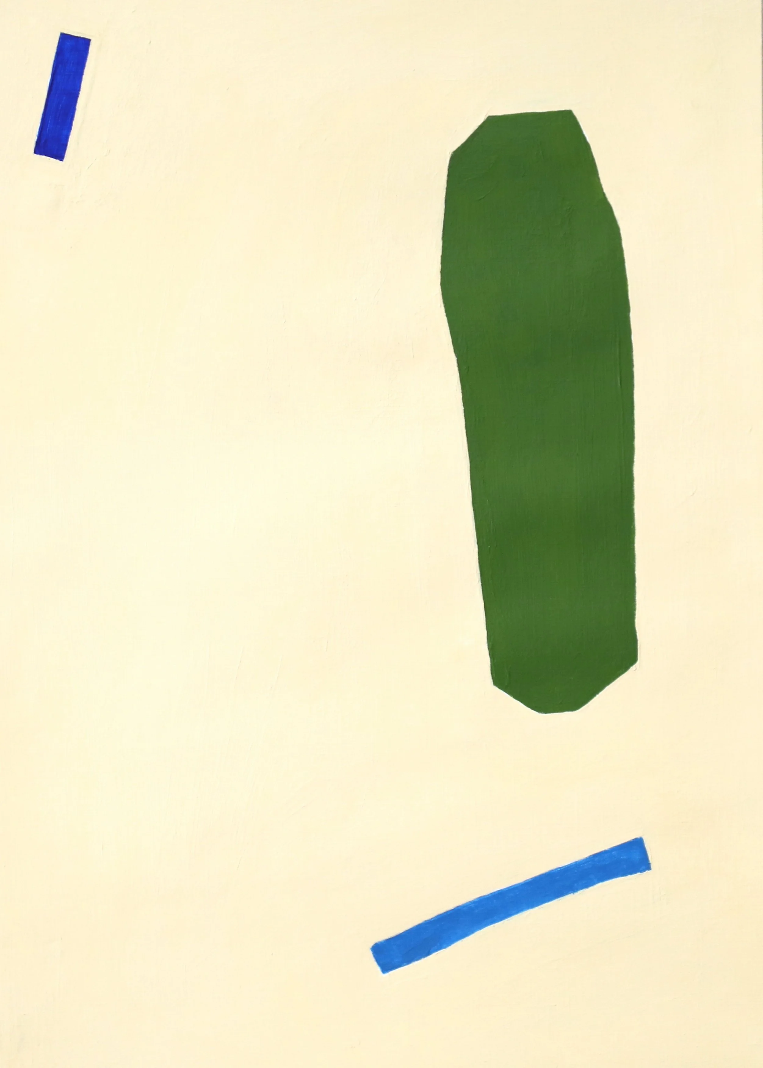 In works such as Prussian Blue F from 2024, the deep blue linear form carries a weight that anchors the composition, while the surrounding pale ground creates a sense of suspended gravity. The blue is not uniform. Its surface bears traces of movement, subtle modulations that recall the physical act of painting. The amorphous shape, rendered in a muted ochre, functions as a counterweight, absorbing the intensity of the blue without neutralizing it. The painting reads as a negotiation between density and openness, between assertion and receptivity.