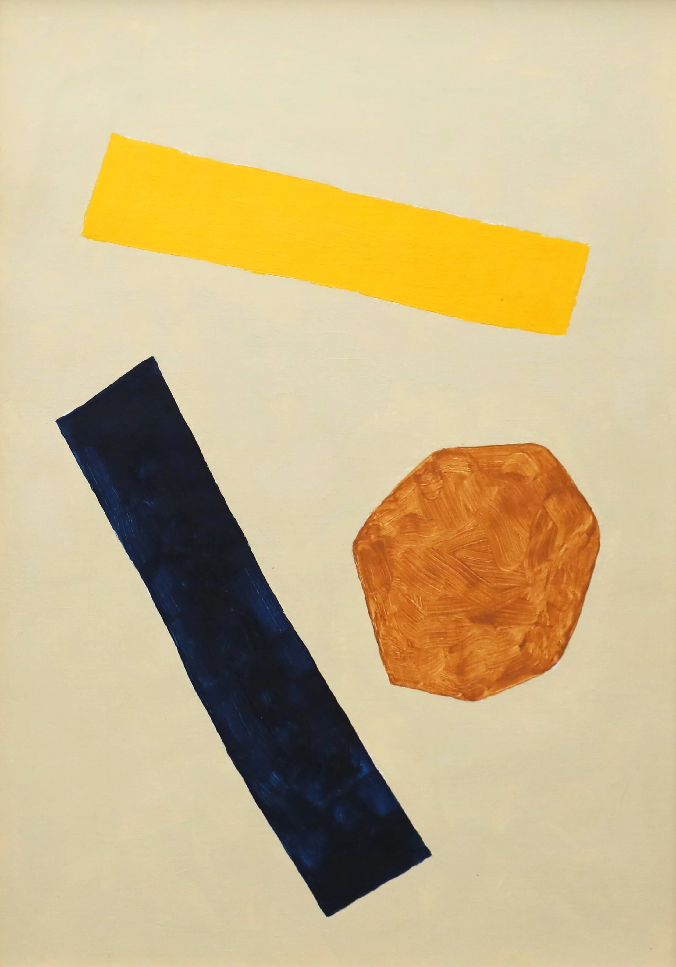 Yellow ZG from the same year offers a different register. Here, the yellow linear element introduces a luminous tension, its brightness offset by darker blues and earthy forms. The yellow is not cheerful in any simplistic sense. It vibrates with a controlled intensity, suggesting both illumination and fragility. The spatial relationships feel provisional, as though the elements have paused mid movement. This sense of arrested motion is a recurring quality in Emerton’s work. The paintings do not depict action, but they are charged with potential.