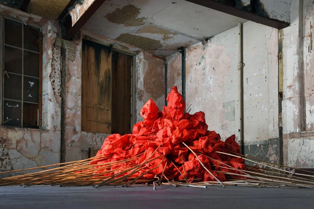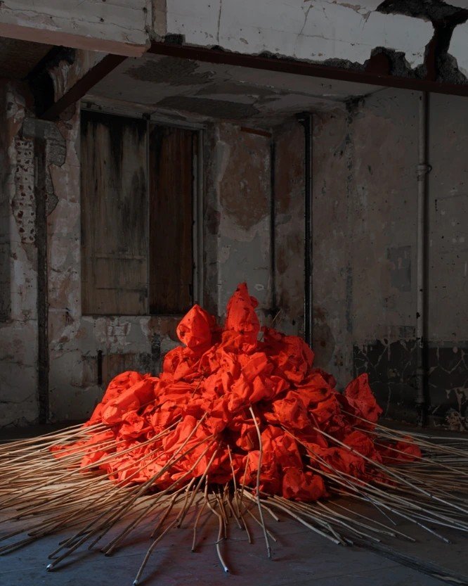 The direction of your work as simultaneously monumental and fragile is a powerful paradox, but what precisely constitutes monumentality for you when it is produced through reclaimed and often lightweight matter, and how does fragility operate not as weakness but as a structural condition that implicates viewers in questions of care, vulnerability, and responsibility?