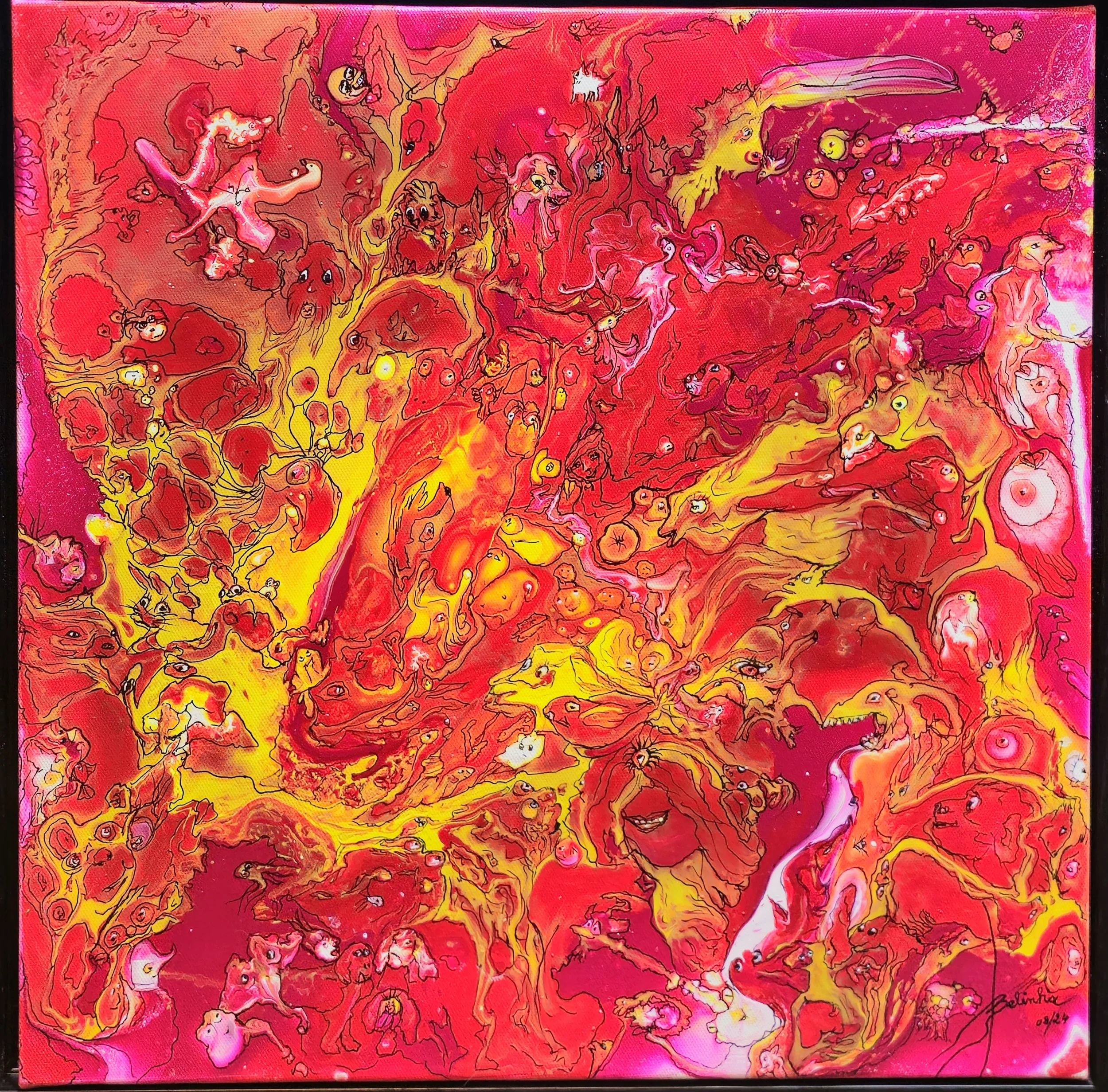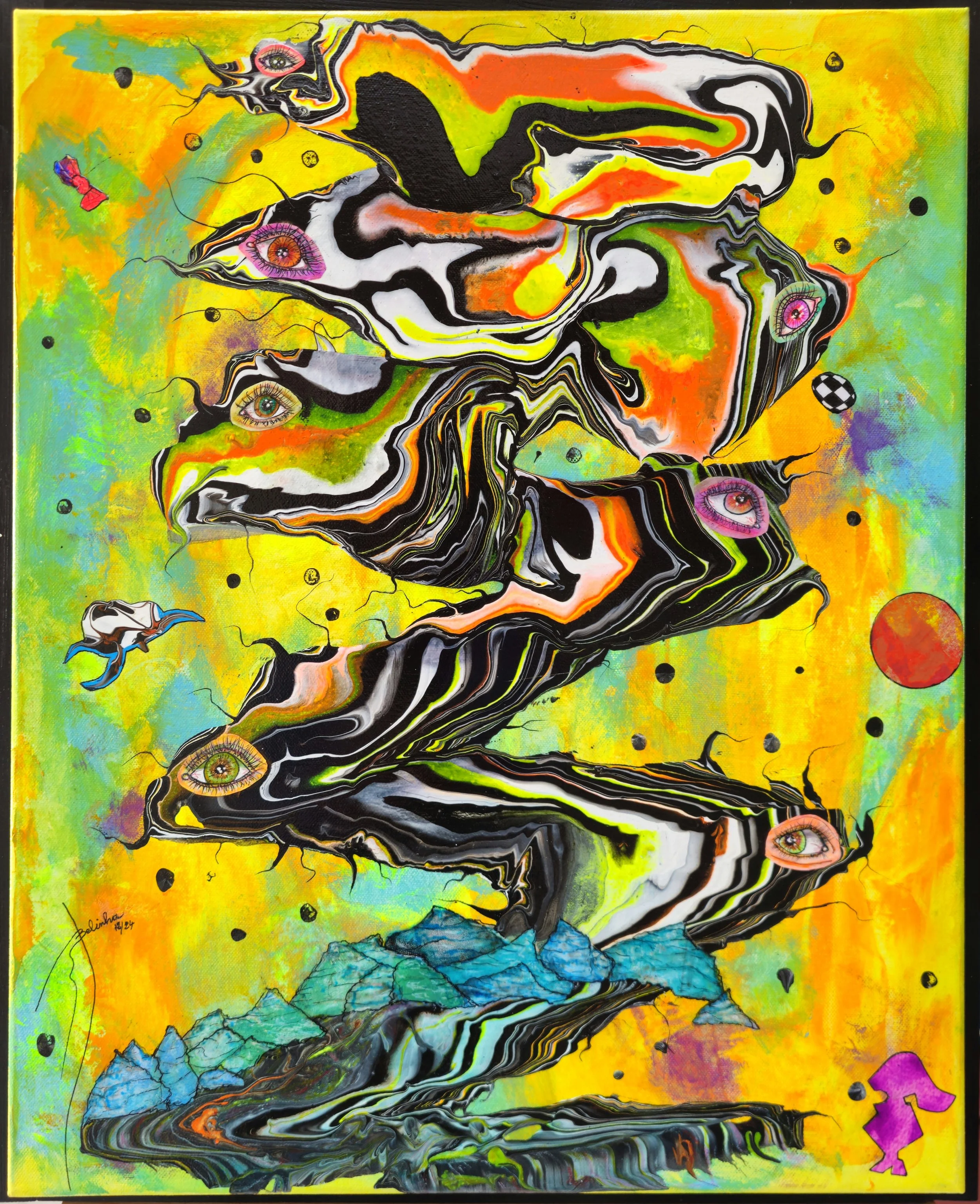 Her artistic universe combines abstraction, contemporary surrealism and pop influences, resulting in vibrant and expressive compositions that invite interpretation. Through the interplay of colour, movement and texture, her works create immersive visual spaces where symbolic elements and organic forms coexist.