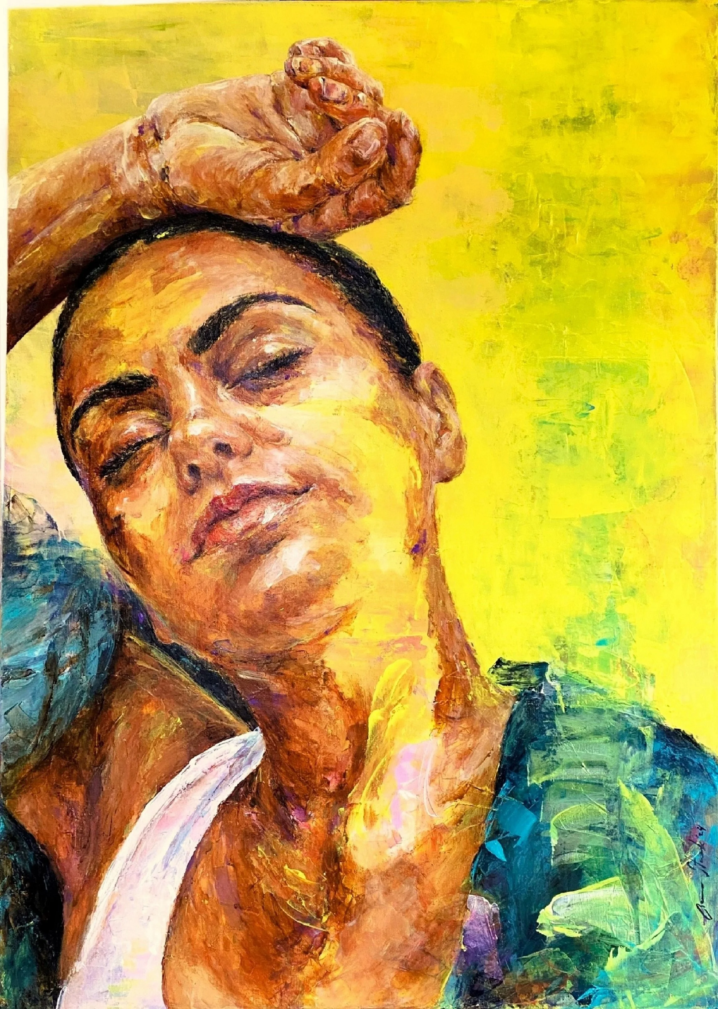 I hope every woman find the strength and the courage to recover and be empowered in knowing our true Grandeur by birthright. May my work be of help”. Bernadette Sterk captures the ‘magnificent splendor’of postures, expressive elements of subtle movement and sphere, in bright color accents.