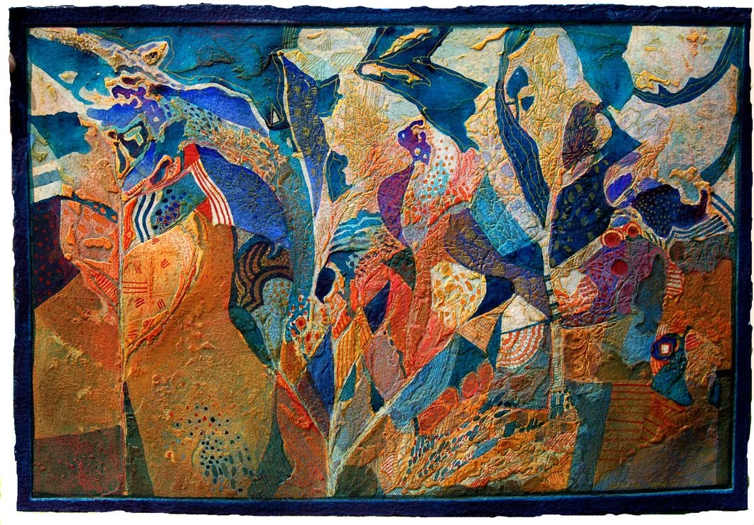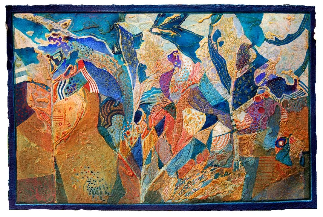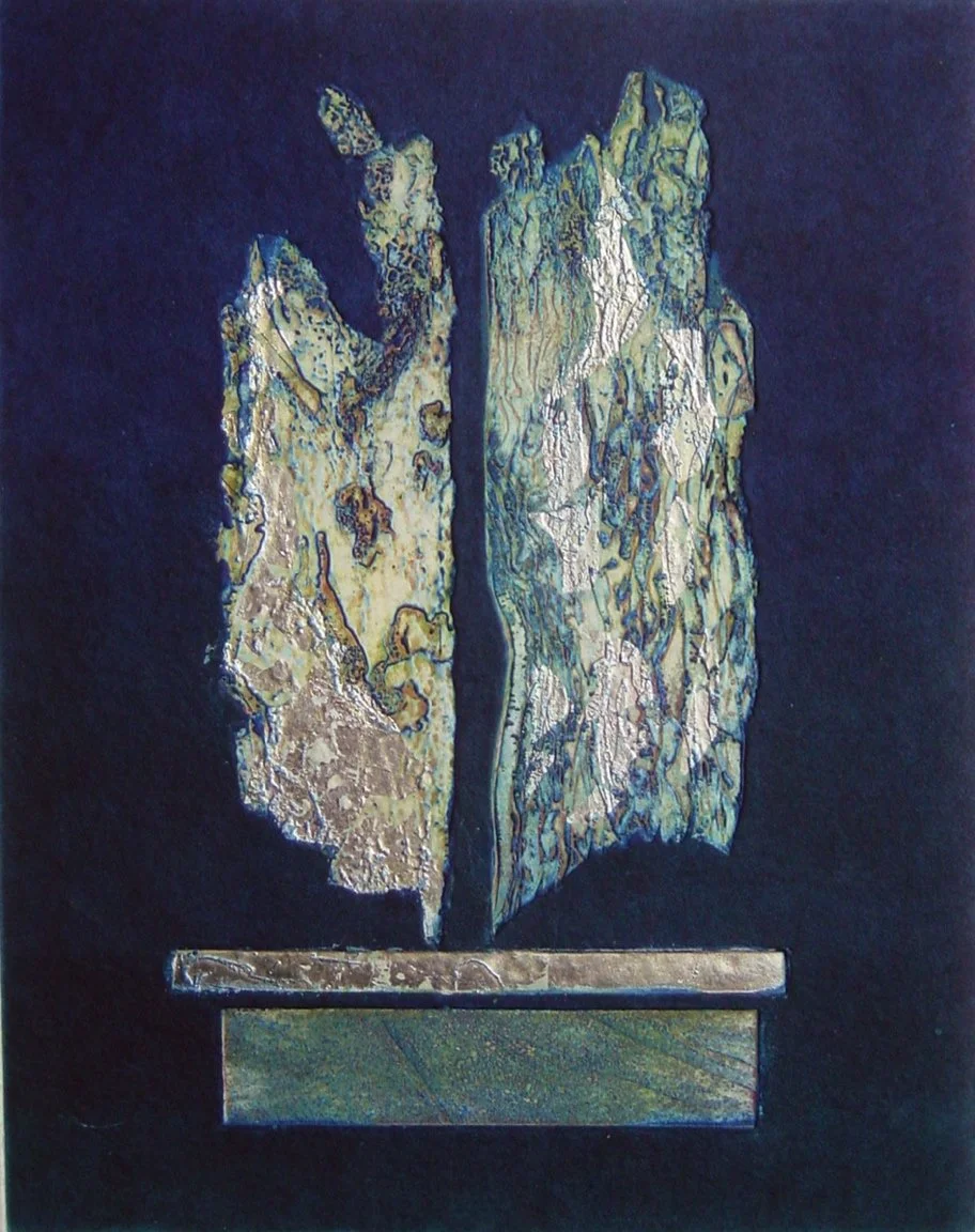 My work is experimental, abstract and embossed. Collagraph, etching, watercolour, collage and encaustic works. My main love is abstracting the essence of the landscape in richly coloured textured works, often enhanced with silver and gold leaf. Recent works include a series of watercolour paintings with collagraph embossings. My early experience as a theatrical designer has led to a sculptural approach to printmaking, and I have developed a method of inking using the different levels of the plate, mixing primary colours on the matrix, thus producing a shimmer of colour, much as lighting a stage set. My work develops though the materials I use. My current on-going fascination is with erosion, weather patterns, natural textures, growth formations and universal organic forms.