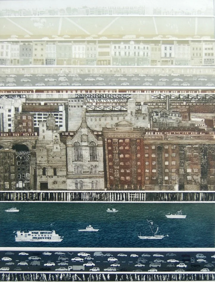 I don’t use photography in my preparation, but when I was working on my earlier representational pieces, I would use drawings from nature and the urban environment, sometimes reduced in size to make an interesting composition. My “Londoners London” series was built up from numerous front-on drawings on the spot, to create the houses, bridges, trains, and distant landscapes. I also found that working on separate plates, compiling the composition as I went along gave me the freedom to use different metals, sometimes leaving them in the acid to destruction.