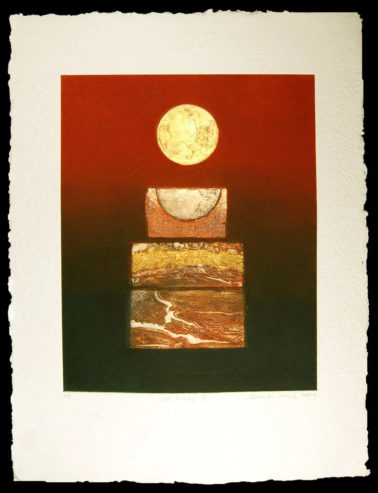 Brenda, your practice repeatedly frames making as a “dance between chance and control,” yet the technical disciplines you deploy in etching, collagraph, carborundum, and monoprint are also systems of regulation, pressure, chemistry, and calibrated risk; how do you theorize the moment when process stops being merely a method and becomes a form of thought in its own right, and what does it mean for you when the plate, the paper, the press, or the pigment begins to behave as a collaborator rather than an obedient instrument?