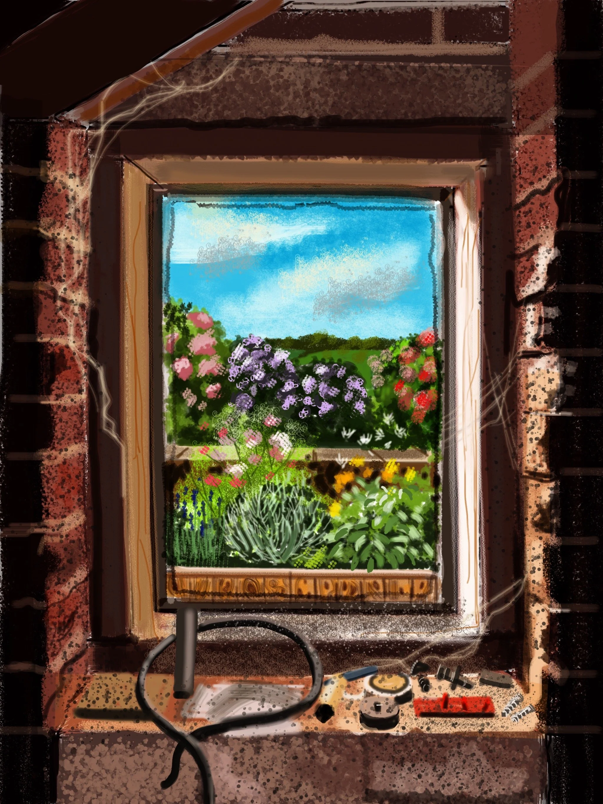 In View from the Boiler House (2025), Wates locates beauty where one would least expect it. The roughness of brick, the detritus of wires and screws, are set against the vibrant profusion of garden beyond the window. The contrast could not be starker: inside, the remnants of labor; outside, the abundance of growth. The composition reaffirms her conviction that ugliness can be transformed by light, that the hidden is always fertile with possibility.