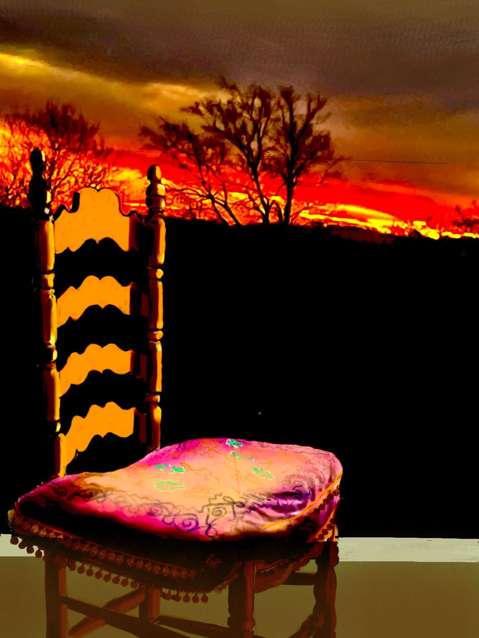 If Roses on a Glass Table explores reflection, Sunset Fire (2022) explores illumination. A chair, draped with fabric, is silhouetted against a burning sky. The intensity of orange and red fuses furniture and landscape, domestic interior and natural exterior. The chair becomes both subject and witness, a presence confronting the sublime. It is at once intimate and cosmic, recalling Van Gogh’s chairs as emblems of solitude, but rendered here within a digital sublime.