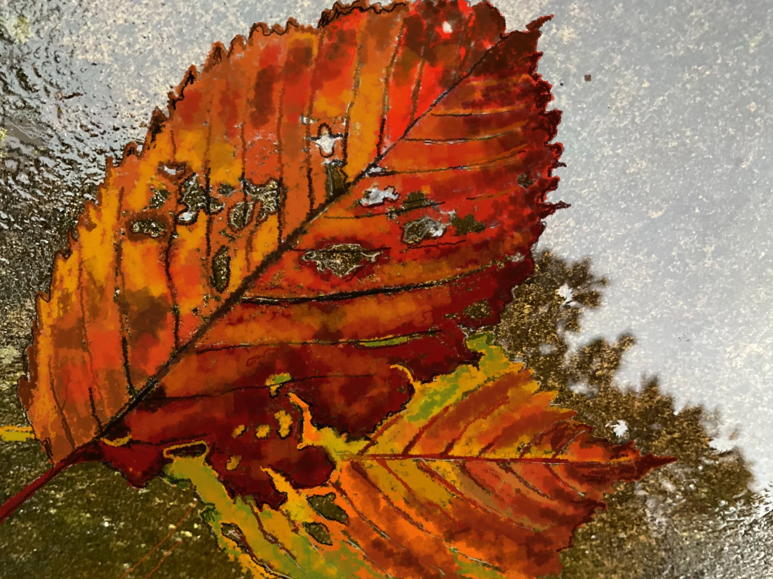 Her attentiveness to seasonal change reaches a crescendo in Autumn Leaves (2024). A single leaf, burnished in orange and red, lies against a surface that reflects the shimmer of water. The digital medium intensifies the saturation of color, while the drawing secures its form. This is autumn distilled into an emblem: beauty at the edge of dissolution, fragility imbued with radiance.