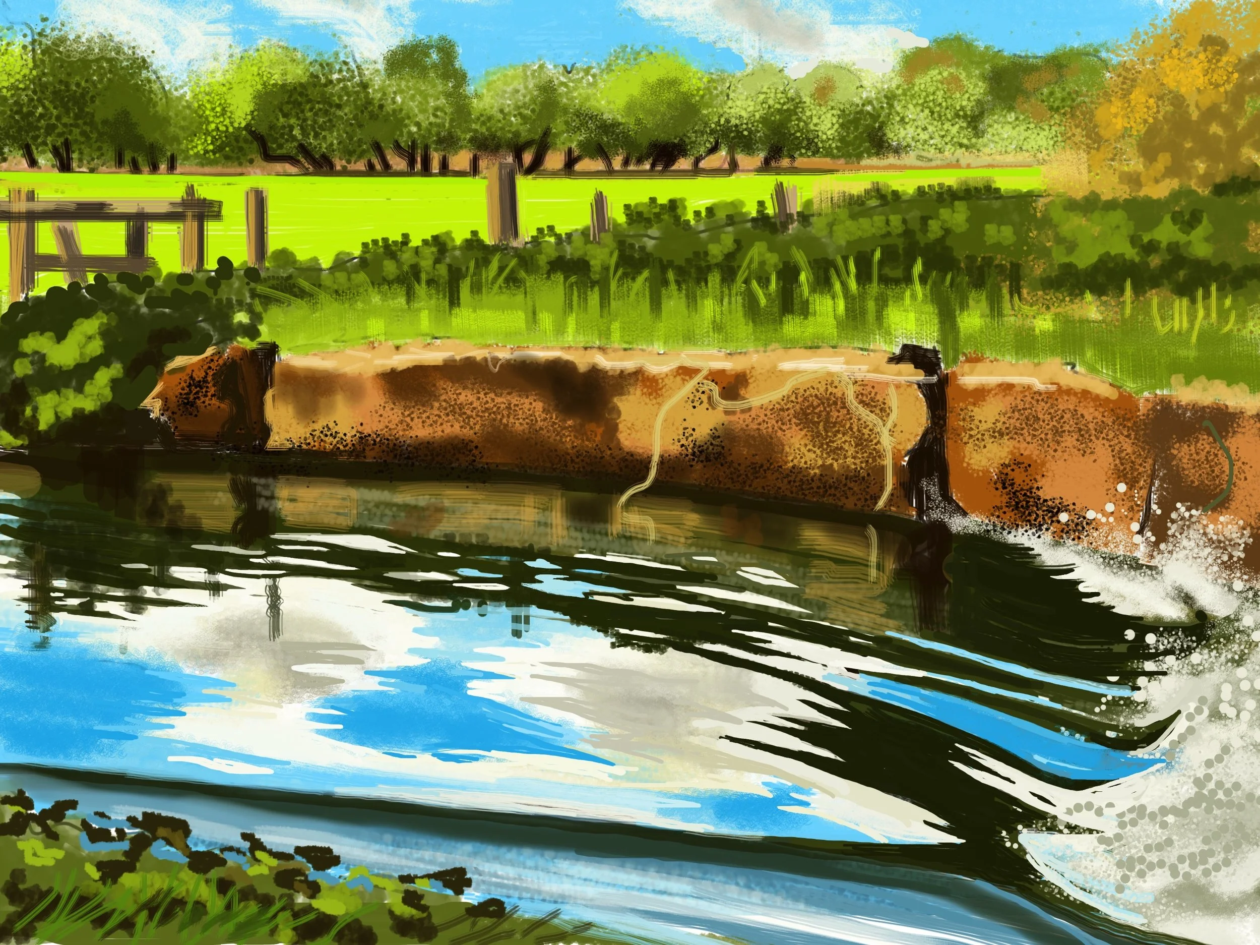 In The Weir (2023), Wates confronts one of painting’s oldest challenges: water. Here the reflection of sky on rippling current is seized with digital immediacy, the brushstrokes simultaneously loose and controlled. One sees the inheritance of Hockney, certainly, yet the piece diverges in its rhythm: where Hockney might insist on broad planes of color, Wates pursues the specific incident of light fractured on surface, the dance of turbulence against stillness. What emerges is not just landscape but an essay on perception itself, the way the eye oscillates between surface and depth, between reflection and flow.