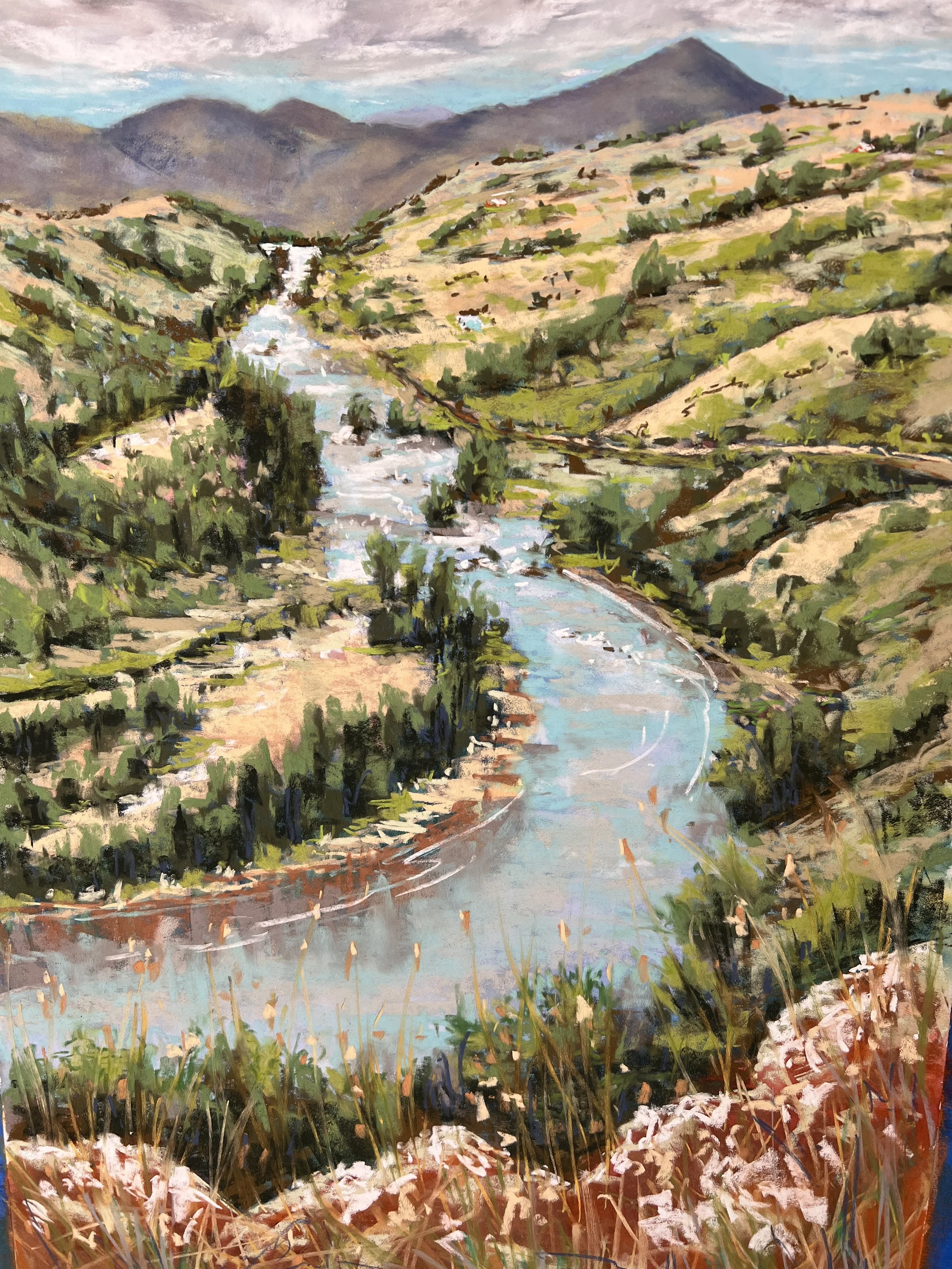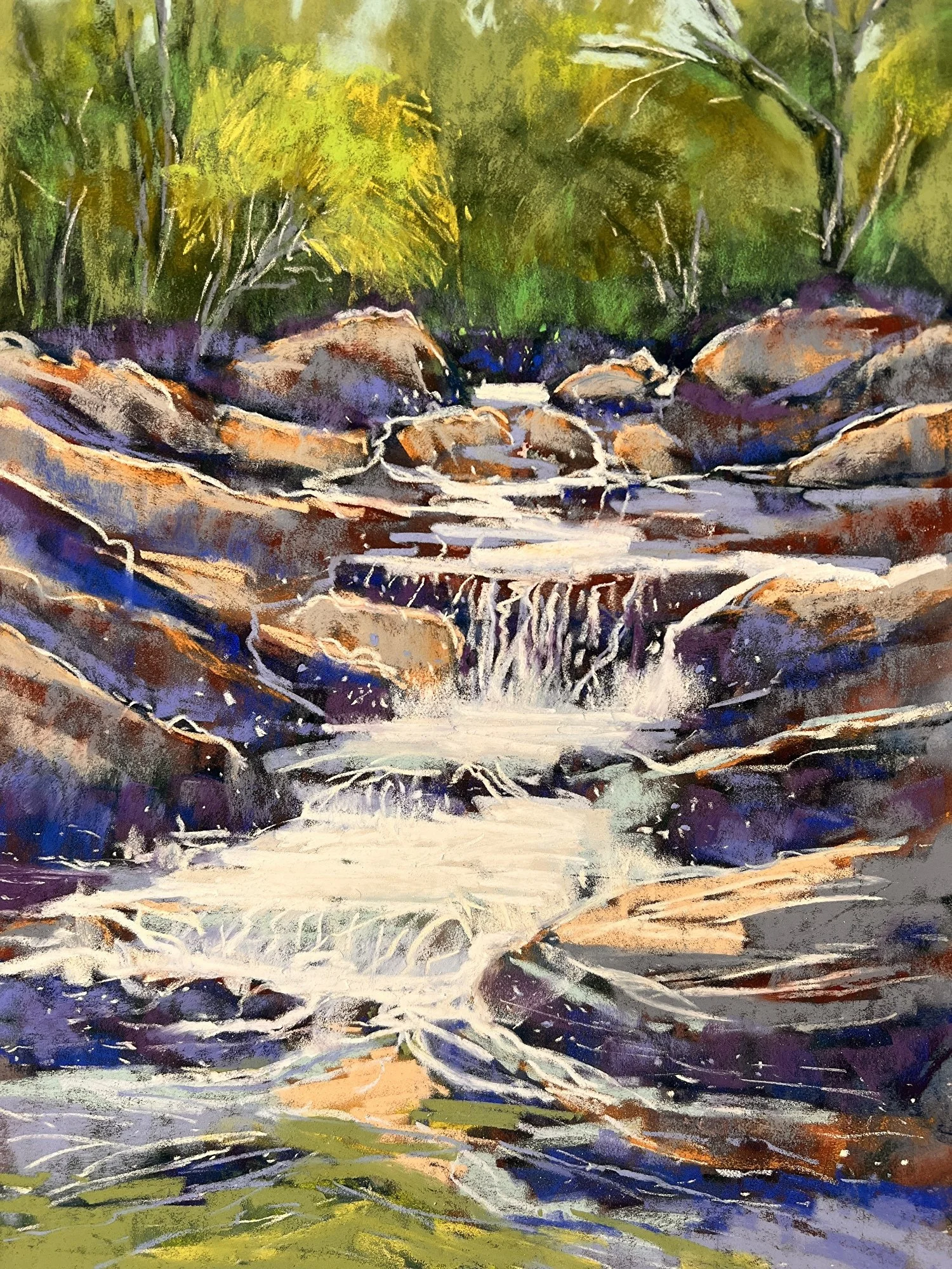 The water flow in the Australian landscape is profoundly important for all Australians, including me, especially with my science training. When painting en plein air, I build water into my realist landscape paintings using a watercolor underpainting technique. The underpainting establishes the compositional elements and bleeds through the upper layers of pastel, lending mood or color intensity to the final painting.