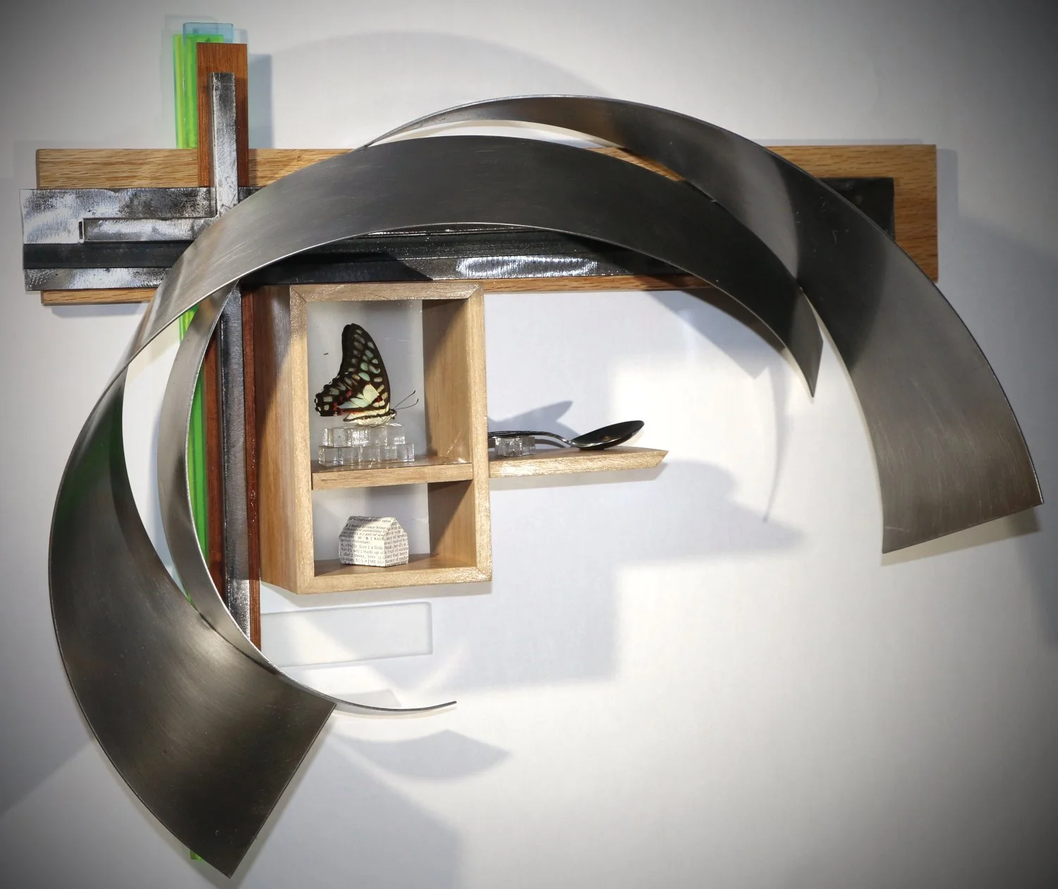 Listen to the Wind - Wood, Steel, Acrylic, Butterfly, Silver Spoon, 43 x 53 x 18cm - 2024