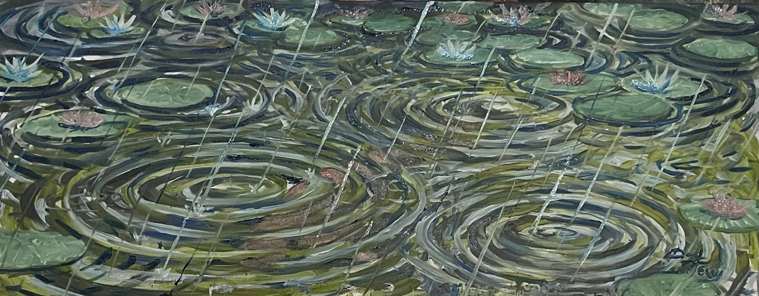 Rainy Pond, 2025, Acylic on Canvas, 40.6 x 101.6 cm.