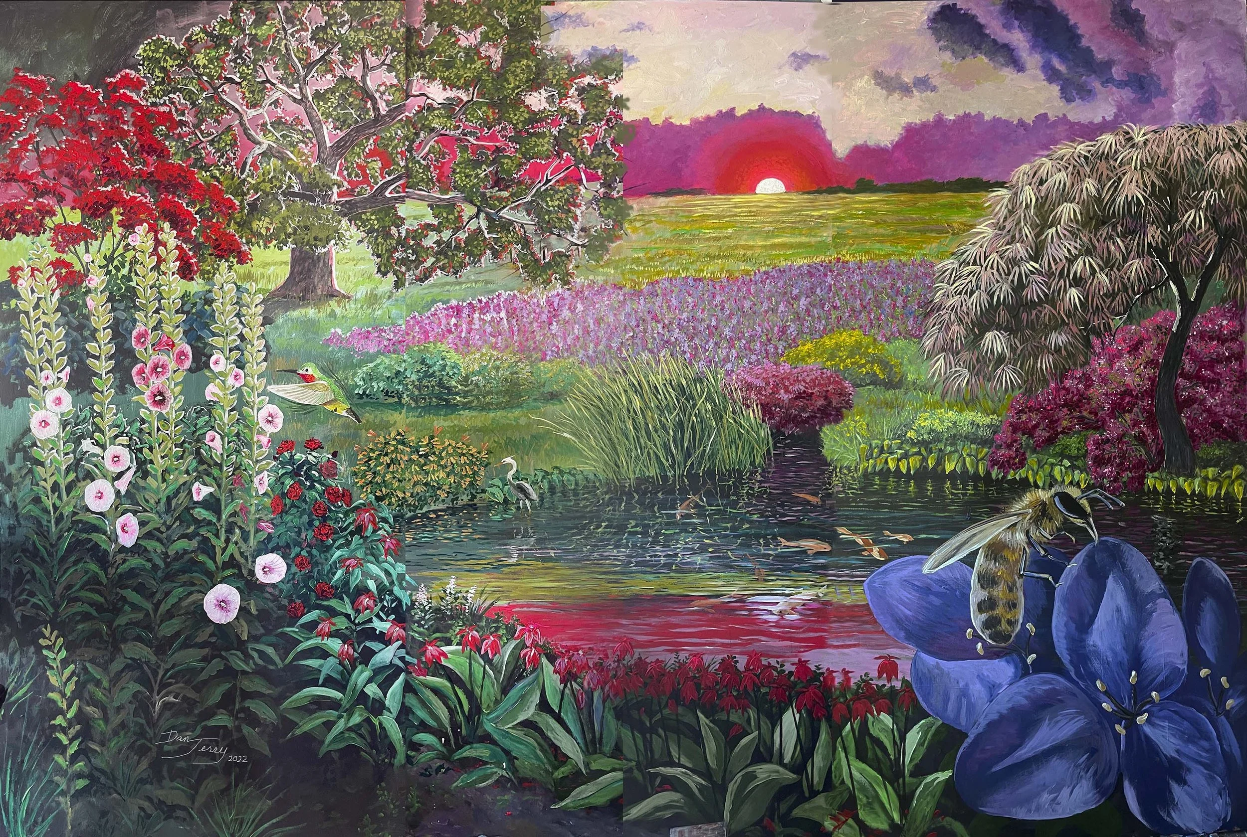 Lake Monet Fantasy Mural, 2025, Acrylic on Cinderblock Wall, 731.5 x 213 cm.