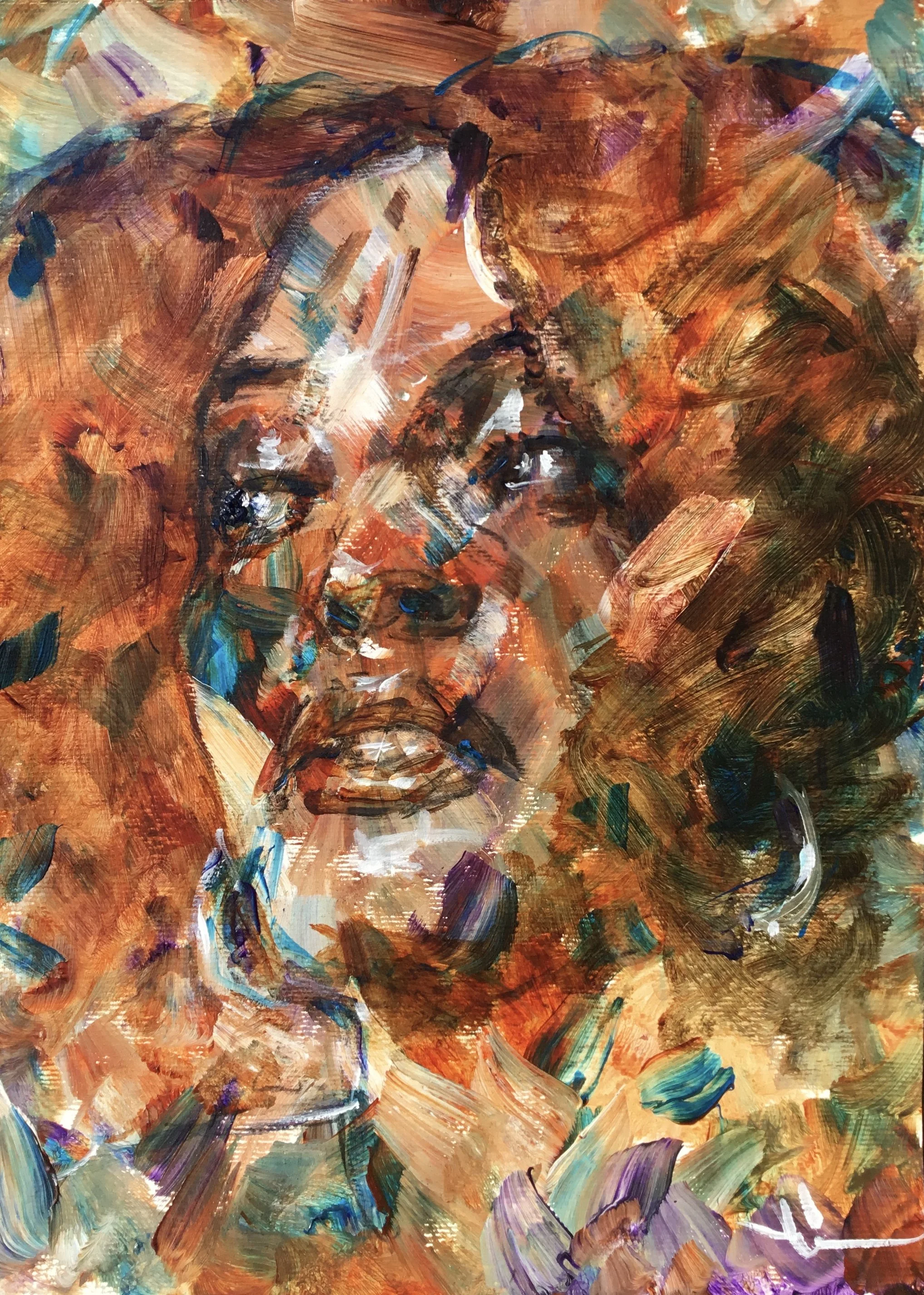 I like surprises. I prepare my backgrounds in advance without knowing what they will be used for precisely. When I do a portrait, I choose a background and I am often surprised by the distribution of colors on the canvas. This surprise is also shared, I believe, by the viewer who interprets it as a feeling or an expression of the model. Of course, the final goal is to obtain a portrait where the color (the chaos) reveals the hidden complexity of the model.