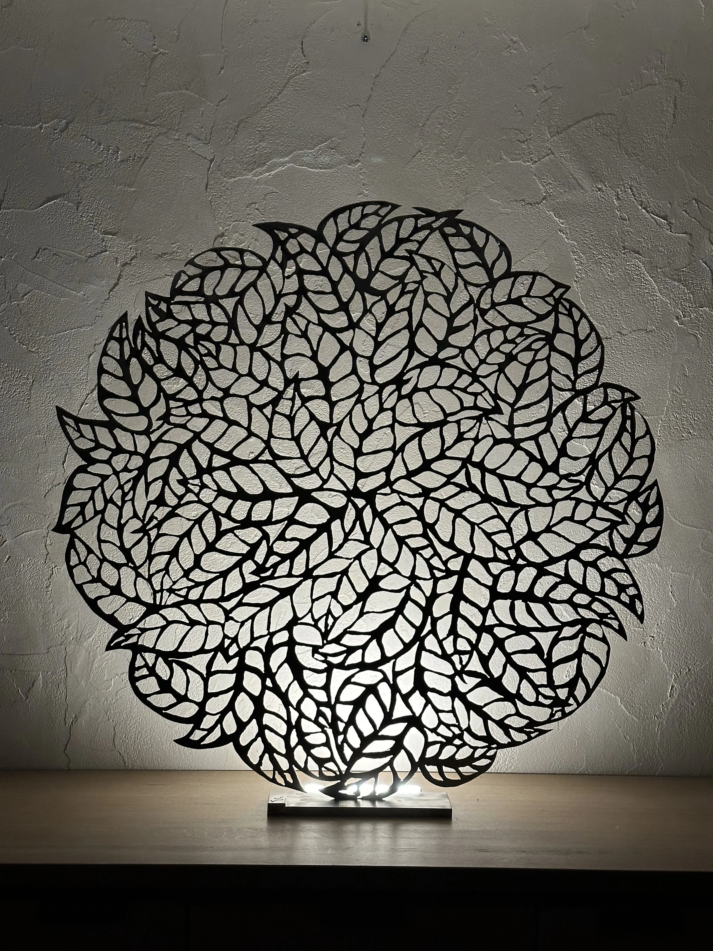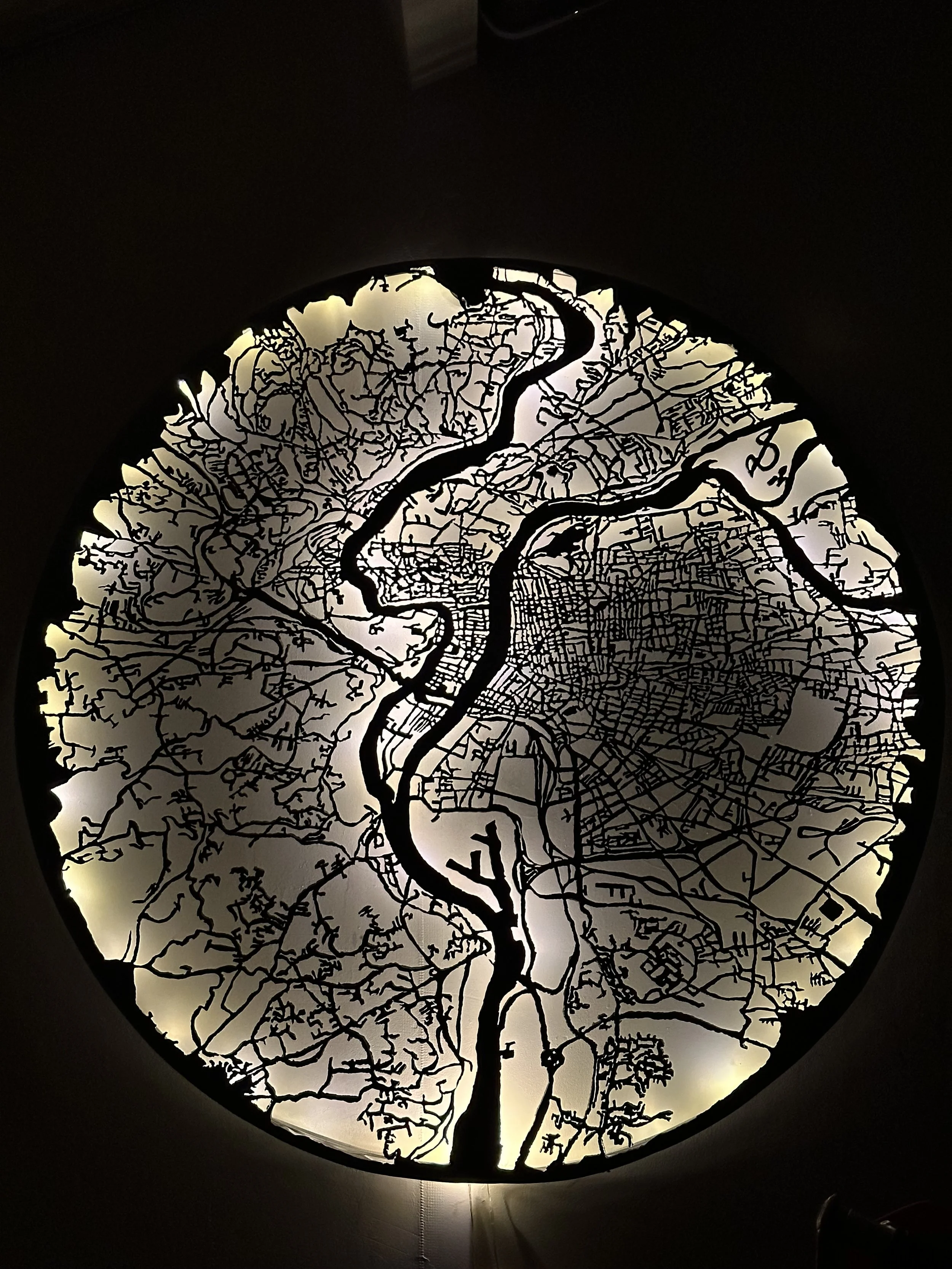 Consider "MONSTERA," a 2024 work that captures the essence of the eponymous plant. The sculpture’s interwoven patterns mirror the lush, perforated leaves of a monstera, yet its composition in steel lends it an almost paradoxical permanence. The juxtaposition of the organic form with the industrial medium embodies Benjamin’s philosophy—a balance between tangible reality and the allure of fantasy. Similarly, "LUGDUNUM" (2024) reimagines the historic city of Lyon through a topographical lens, presenting its map-like silhouette as a glowing, circular wall-mounted piece. The interplay of light and shadow here transforms a functional representation into an evocative symbol of history and community.
