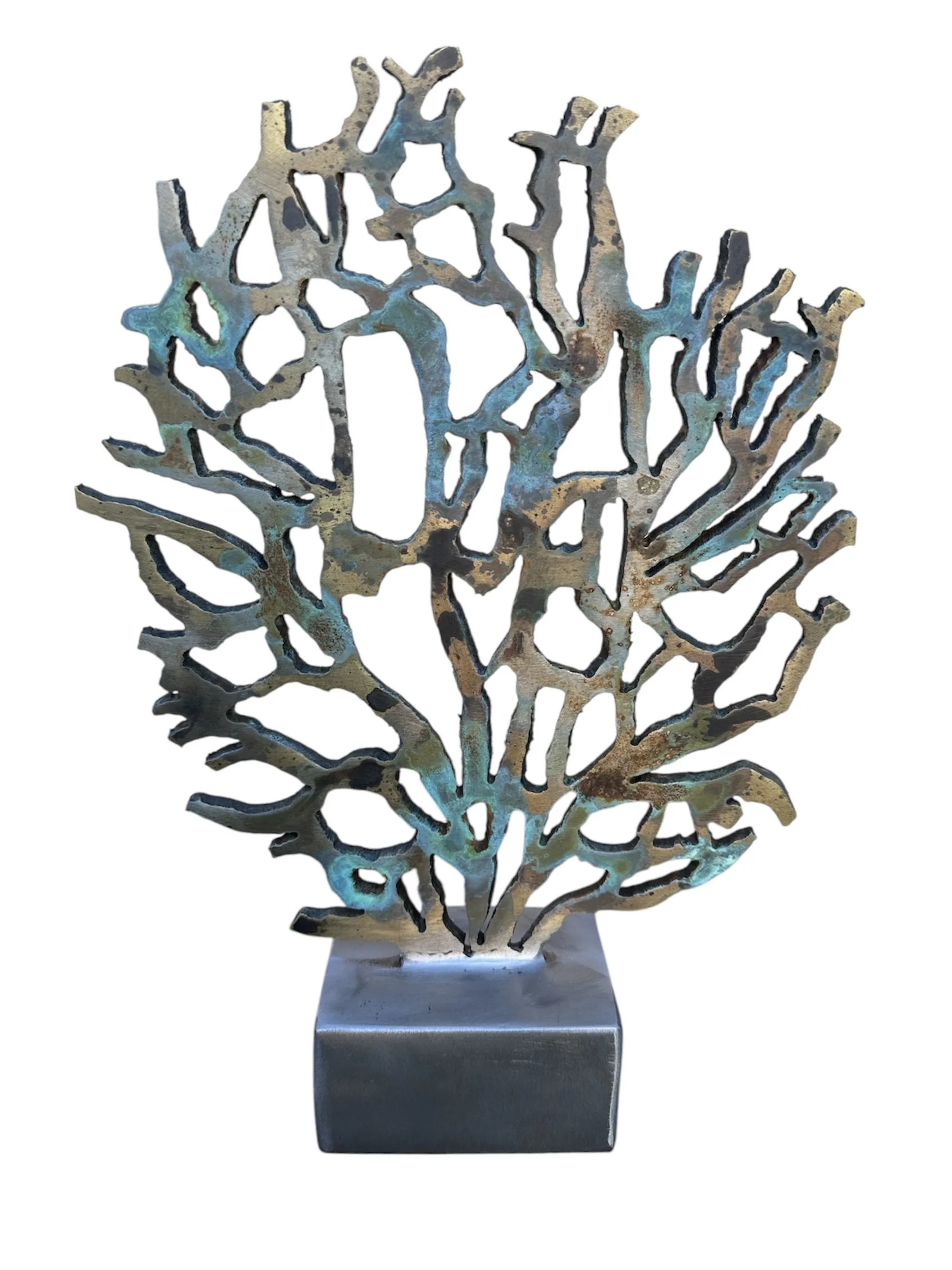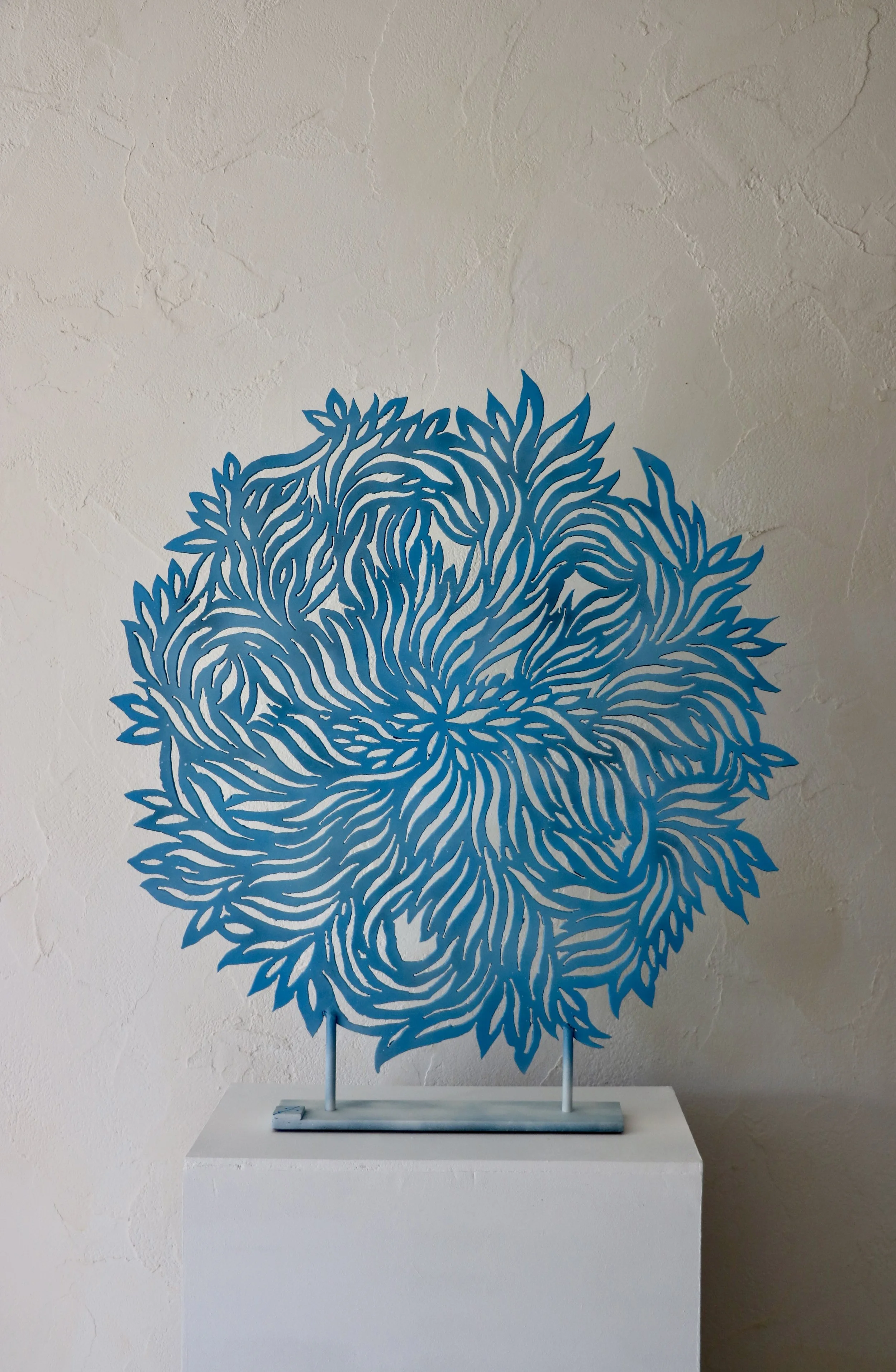 At the core of Ferry Benjamin’s practice is his mastery of the manual plasma cutter. This industrial tool, traditionally reserved for heavy manufacturing, becomes in his hands an instrument of sublime precision and expression. Benjamin cuts through dense steel with the dexterity of a painter wielding a fine brush, transforming the unyielding material into intricate lattices that mimic organic forms. The result is a body of work that blurs the line between the natural and the industrial.