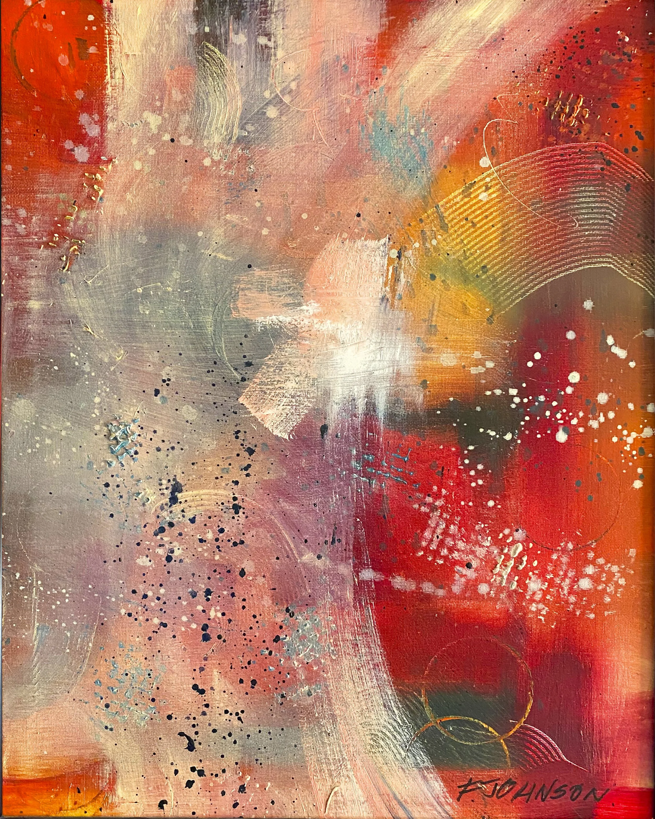 Likened to an analogy of short stories, Fran Johnson’s art resonates with a merging of color and light. Noteworthy is her ability to balance chaos with control and give the participant a view of connecting patterns of color. Each painting has a story behind it and presents a linear narrative projecting the enduring power of abstract art to captivate.