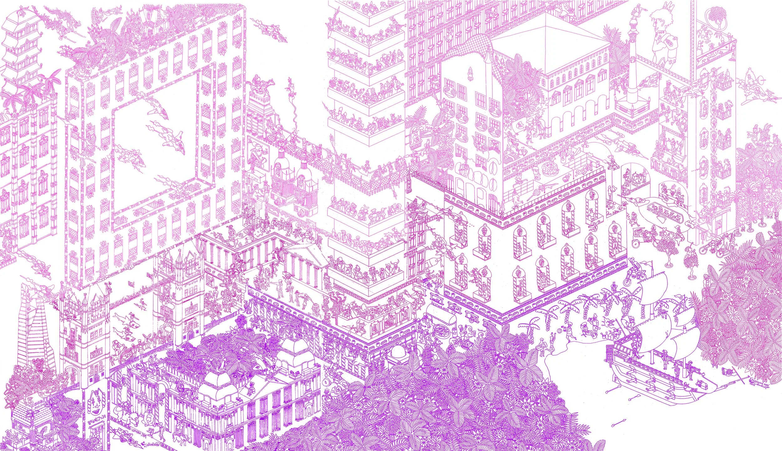 He tries to create utopian cities according to steam punk science-fiction theories. He aims at hyper-figurative representations, where fantasy and precision go hand in hand. His latest handmade etchings are 1x1.5 m and it took him 1300 hours of work, covered in several months, to make them.