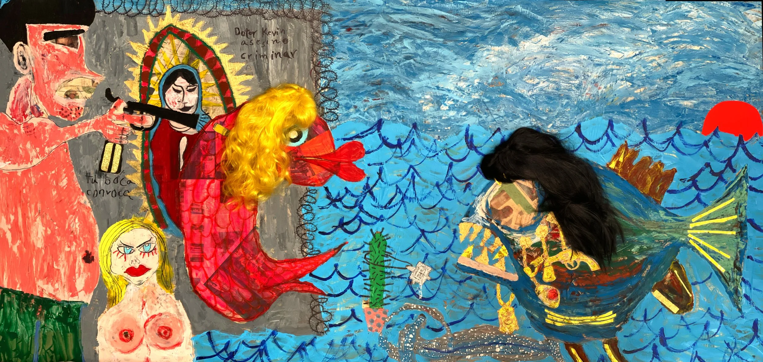 “Chicho and his cousin Dmitry left the Romanian Carpathians. In Corsica stole a 35-carat ruby, and as they went through Vejer de la Frontera picked up a typical local saguaro called chumbo. At the dock of the Illustrious, Heroic and Generous city of Alvarado-Veracruz, Altagracia Coronel de la Garza awaits him, a mixture of red mullet and monkfish. She has just received two bullets directed at her head, from her fiancé Chuy Vicente Flores Reyna. He found her after an agonizing two weeks’ search, from Acapulco-Guerrero to Lázaro Cárdenas, where she was last seen partying with Aneska Ambrosio -Papon, humble lamb of God. Frasquito Raymond-Gil”. 240x120 cm. Mixed media on wood. 2022.