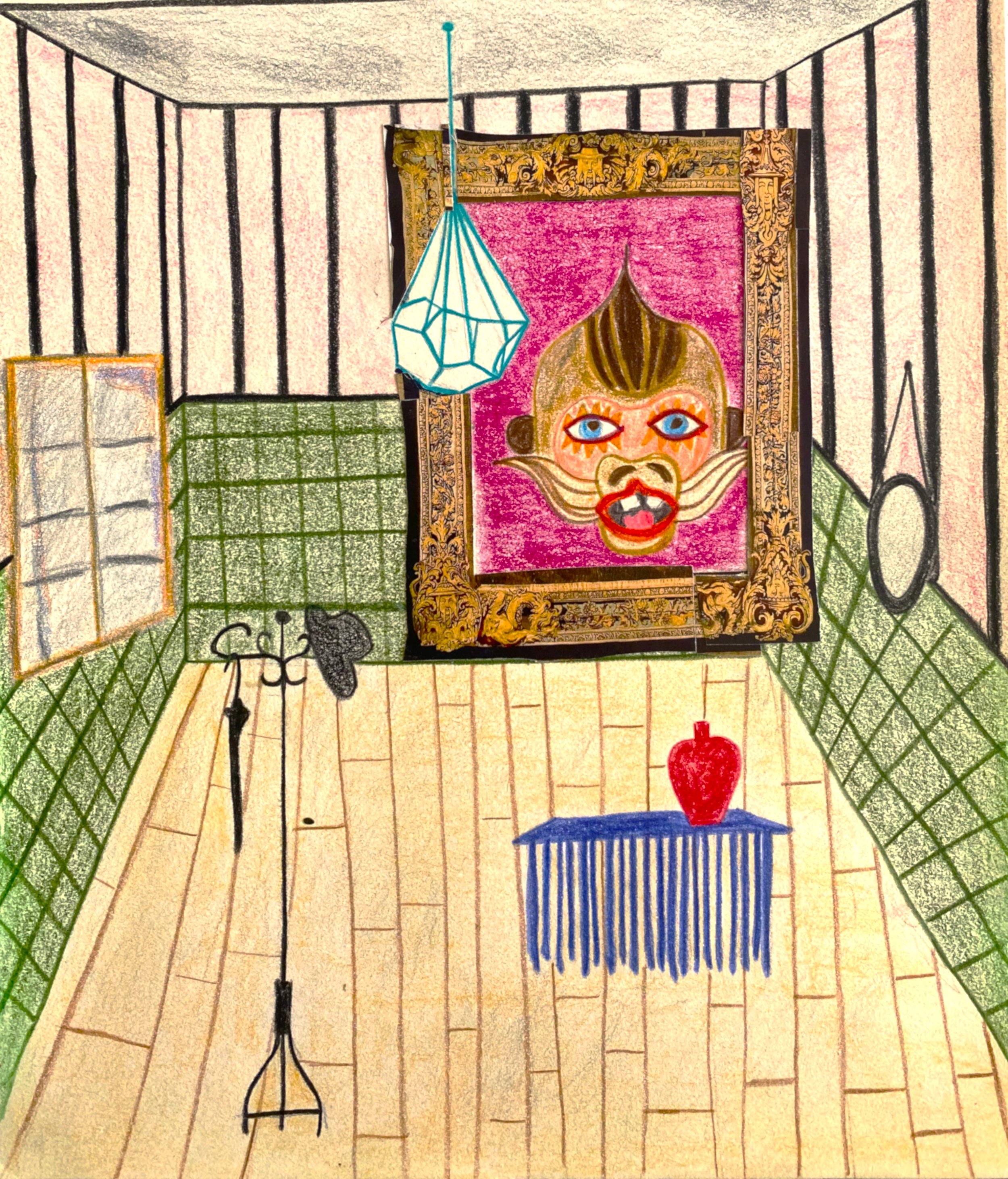 A relentless traveler, I draw inspiration from any detail or encounter I read about or witness. All these fragments fuse into something deliberately absurd. Influenced by naïve art, Rousseau’s jungles, and Condo’s distorted heads, my style is direct, spontaneous, and raw—defined by rudimentary lines, vibrant colors, and a joyful disregard for perspective or proportion. Collage elements intensify the awkwardness and add a distinctly personal layer to each composition.
