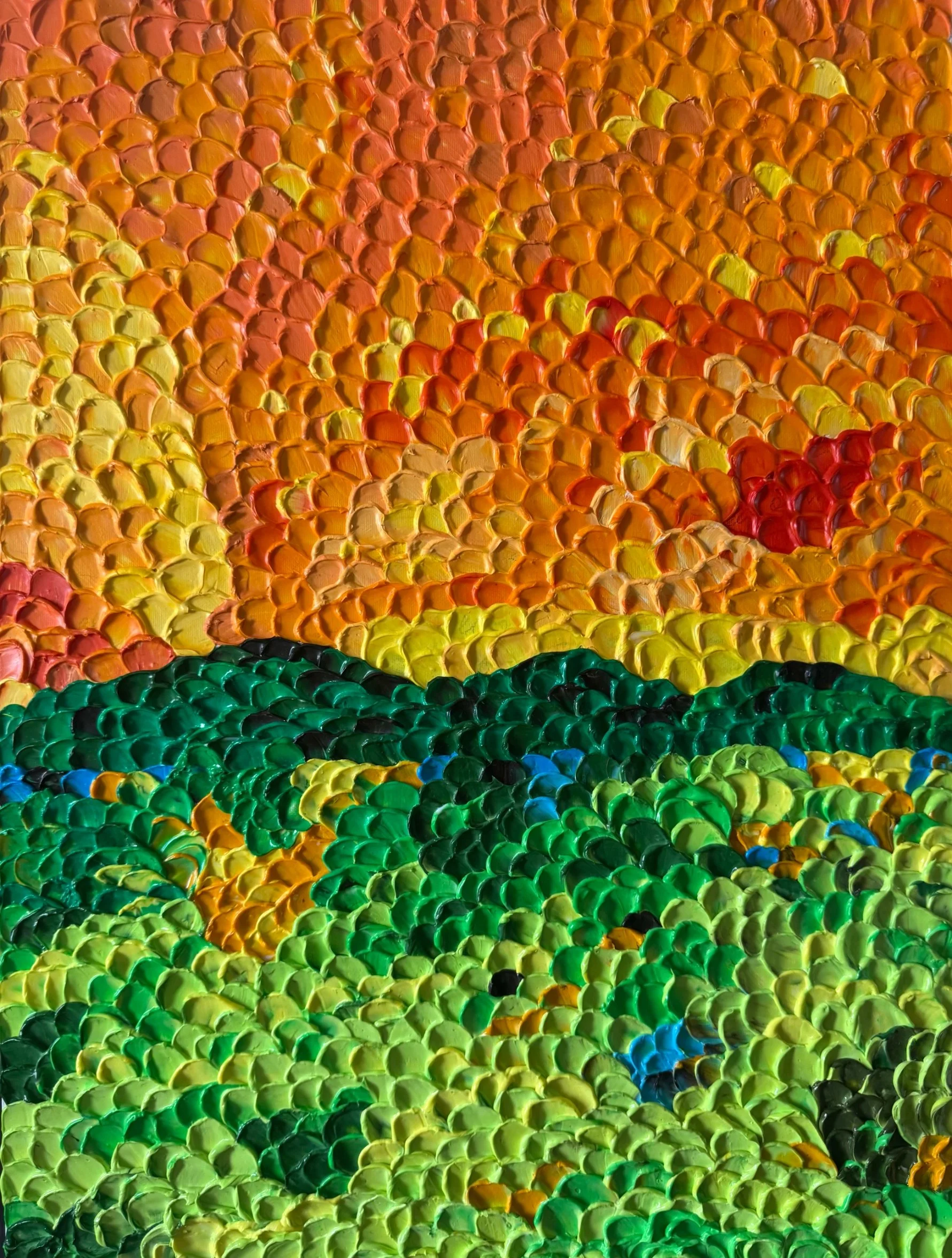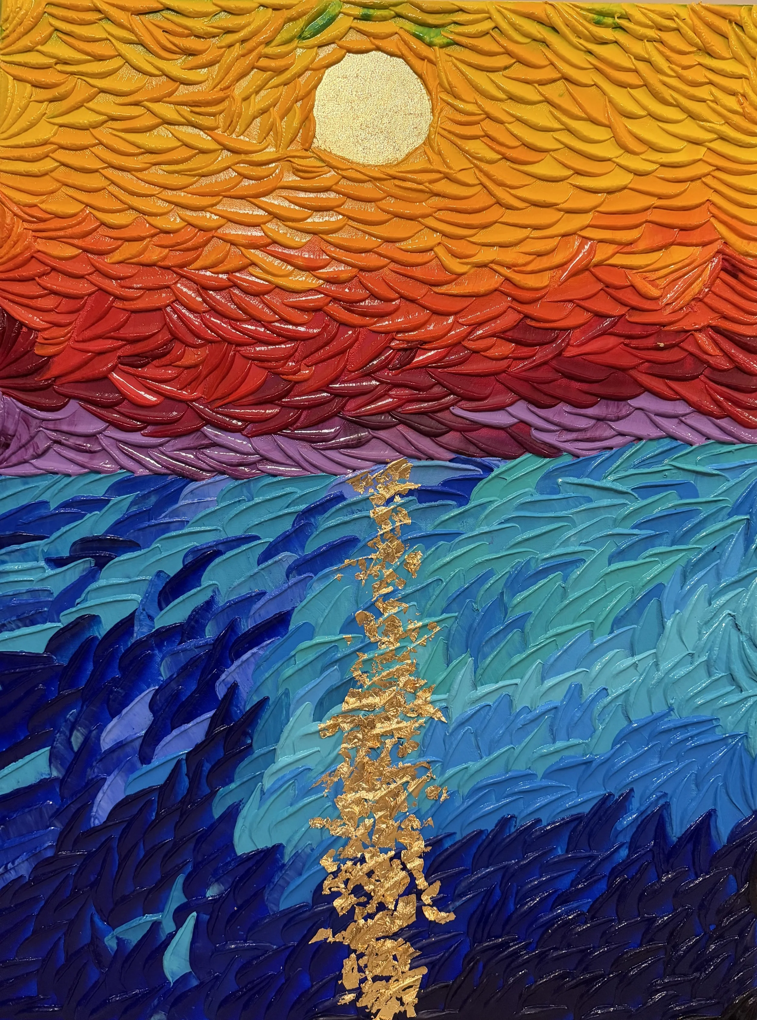 Creating textured art is an intensely tangible experience that brings the artwork alive for me. I use palette knives for layering and mixing heavy body acrylics with gel mediums. I also use gold leaf quite regularly as I am drawn to the color of gold, a powerful symbol of abundance. I continue working until I feel excitement and can embrace the artwork unconditionally. The whole process consistently feels cathartic, infusing me with a deep sense of joy and fulfillment.