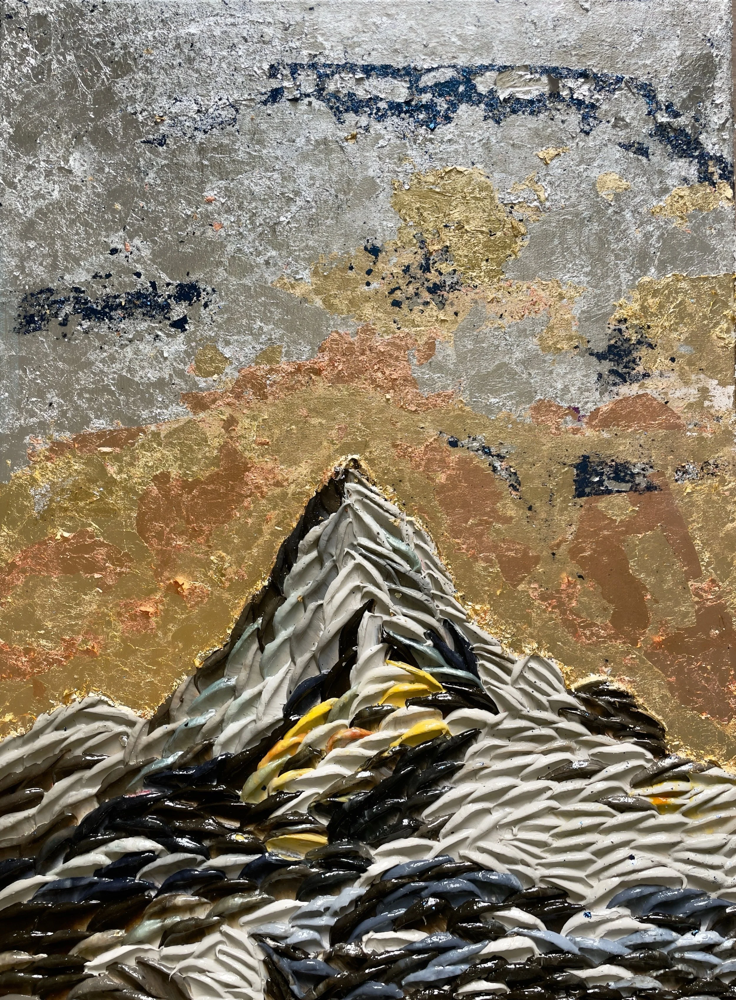 Matterhorn, 2023, Textured Acrylic on Canvas with Gold, Silver and Rose Gold Leaf, 60 x 46 cm