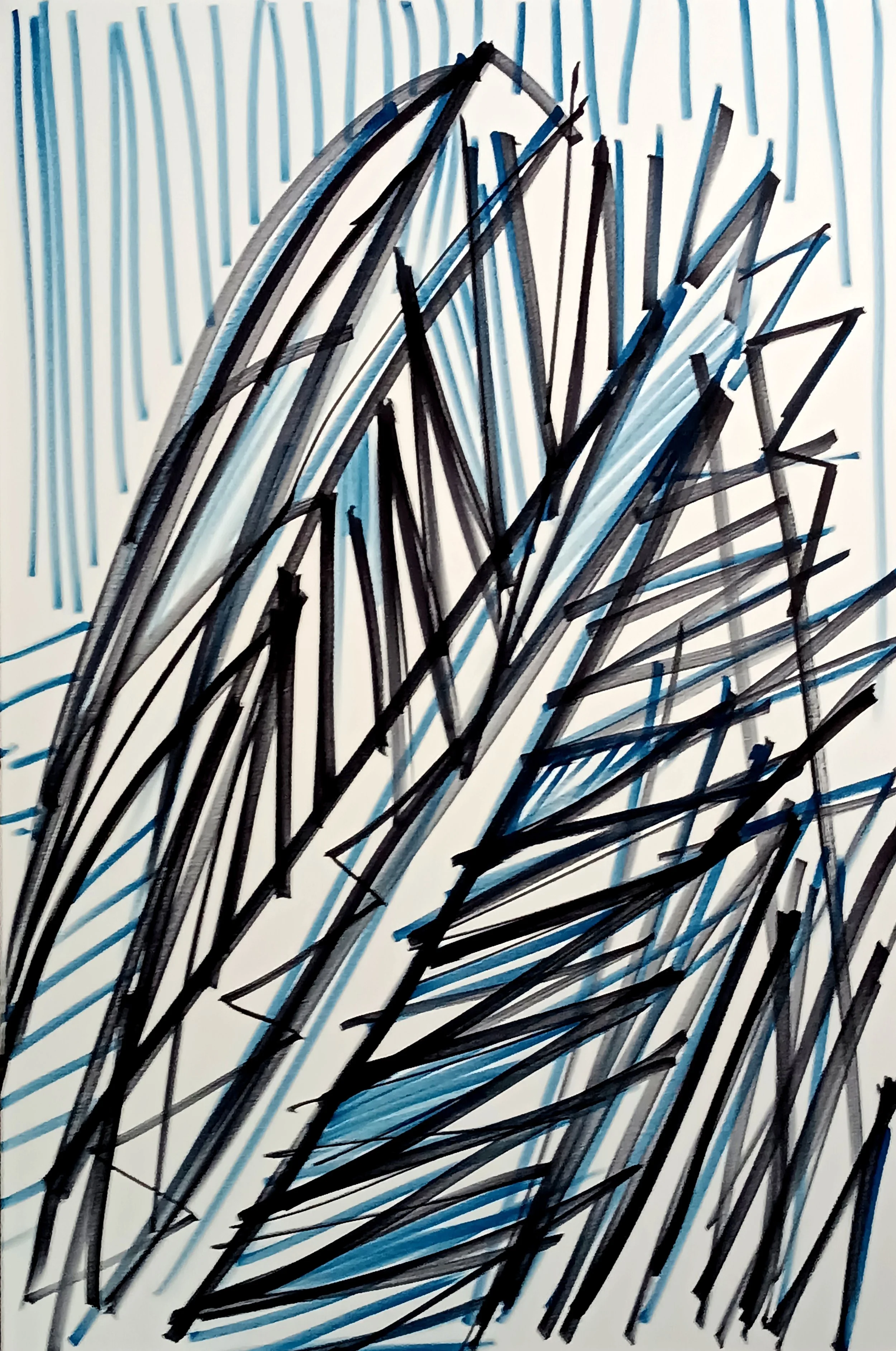 In Ghost from 2025, a different register appears. Here a very dark, almost nocturnal ground of deep blue, black and muted rust hosts a web of fine white lines that traverse the surface in angular trajectories. These lines suggest both drawing and architecture. They recall scaffolding, skeletal frames or the outlines of a structure that has never been built. Bits of turquoise emerge behind them, hinting at depth, as if another luminous space lay just beneath the skin of the painting.
