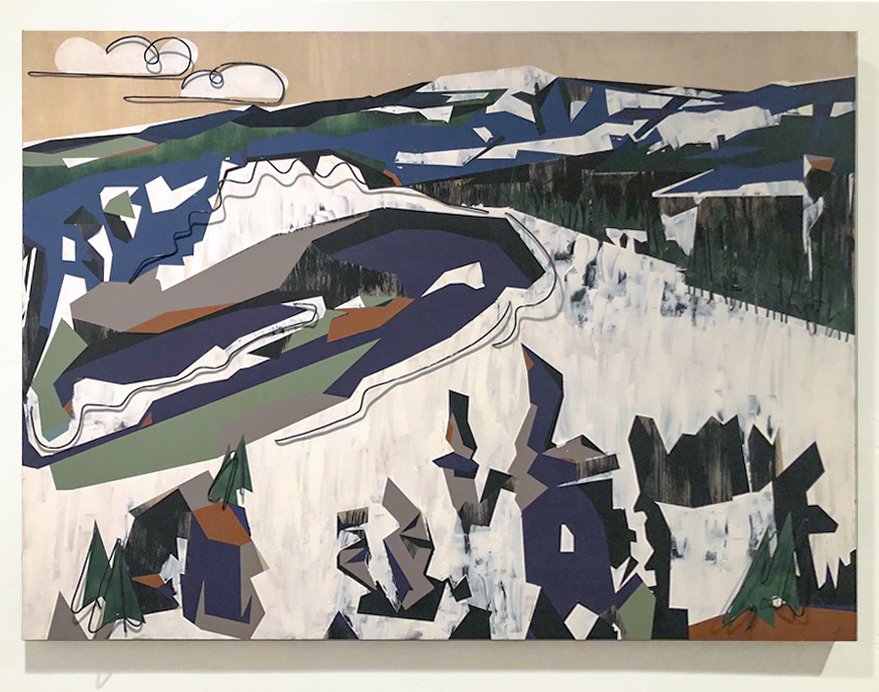 “Spring Thaw” (2021) amplifies this principle into a more expansive field. The composition reads as a sweeping topography, but its articulation is resolutely graphic: broad areas of white suggest melting snow, while deep blues and greens stack into ridges and distant mountains. The pictorial space is simultaneously deep and flat, an oscillation that recalls modernism’s refusal of stable illusion. Yet Côté complicates the modernist flatness by introducing wire elements that hover at the surface and then step forward into real space. The wire cloud at the upper left, delicately looping, sits like a punctuation mark in the sky, but it also announces the painting’s refusal to be only an image. The thaw, then, is not only seasonal. It is conceptual. The work thaws the rigid separation between depiction and construction, between landscape as motif and painting as object.