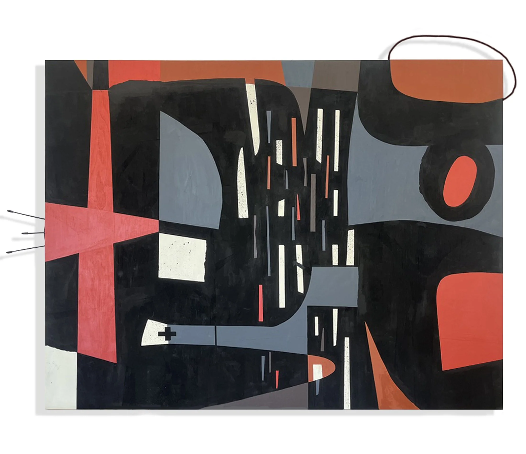 If the landscape works stage the meeting of terrain and diagram, and the urban works stage the compression of sign and structure, the more abstract pieces reveal the core of Côté’s practice: an exploration of how form behaves when it is forced to become spatial. “Round & Round” (2024) unfolds across a wide panel like a dynamic circuit. Large black shapes, arcs and blocks, lock into fields of gray blue, cream, yellow, and red. Circular motifs appear, not as stable centers but as rotational forces, suggesting repetition, recurrence, a kind of visual time. A wire line near the central seam functions like a hinge, a drawn thought that cannot quite settle. In the upper right, a circular form reads simultaneously as a target, a record, a loop. The painting’s logic is not narrative in the literary sense, but it is temporal. It insists that looking is not instantaneous. The viewer’s eye must travel, return, reorient. The title becomes a description of perception itself: round and round, not because the painting is confusing, but because it is structured to produce sustained engagement, to resist the quick consumption that contemporary images solicit.