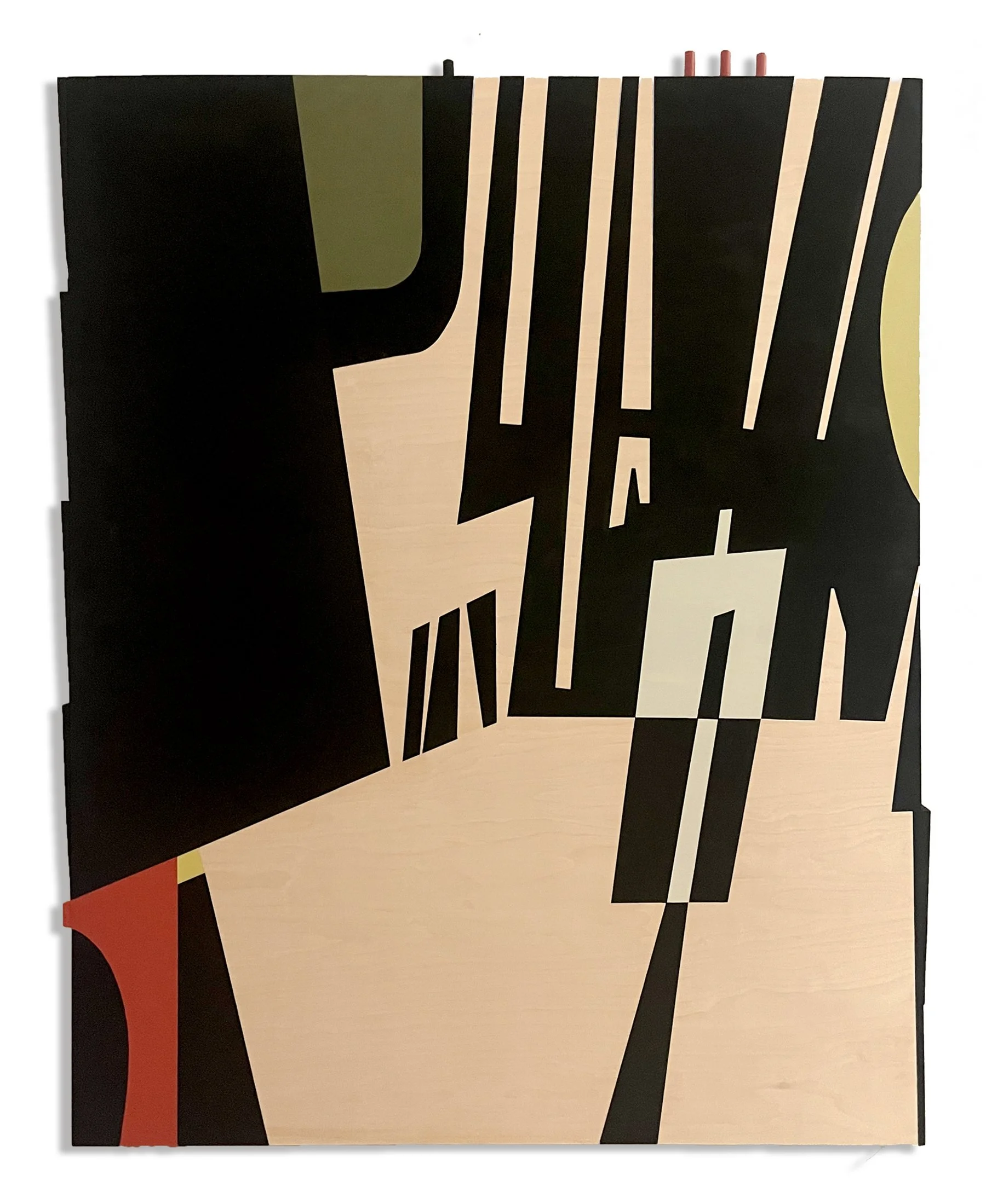 2025. "Groove" acrylic on wood panel with dimensional elements in wood.