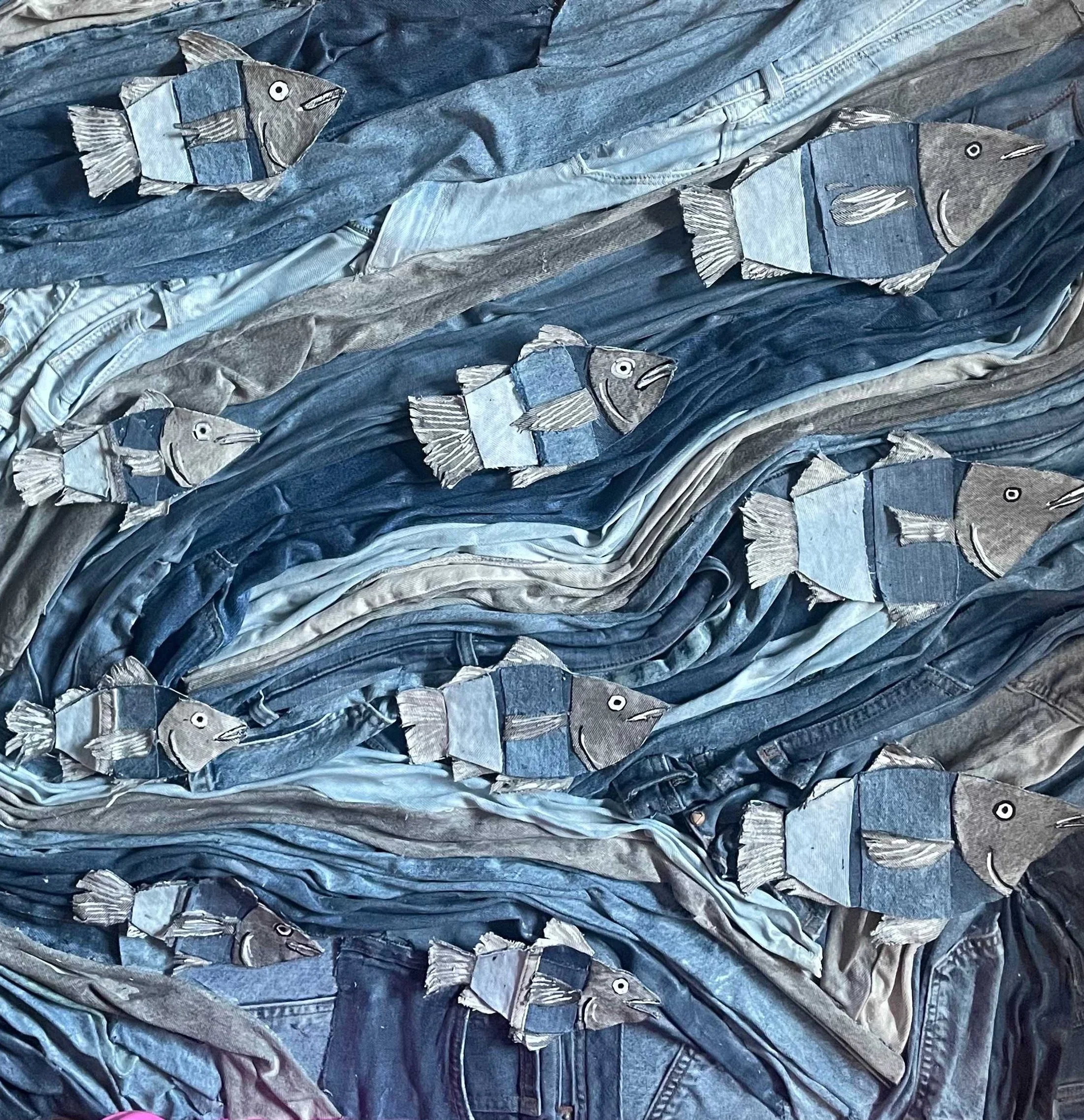 The waterfall fish, recycled jeans on canvas, 80x100 cm