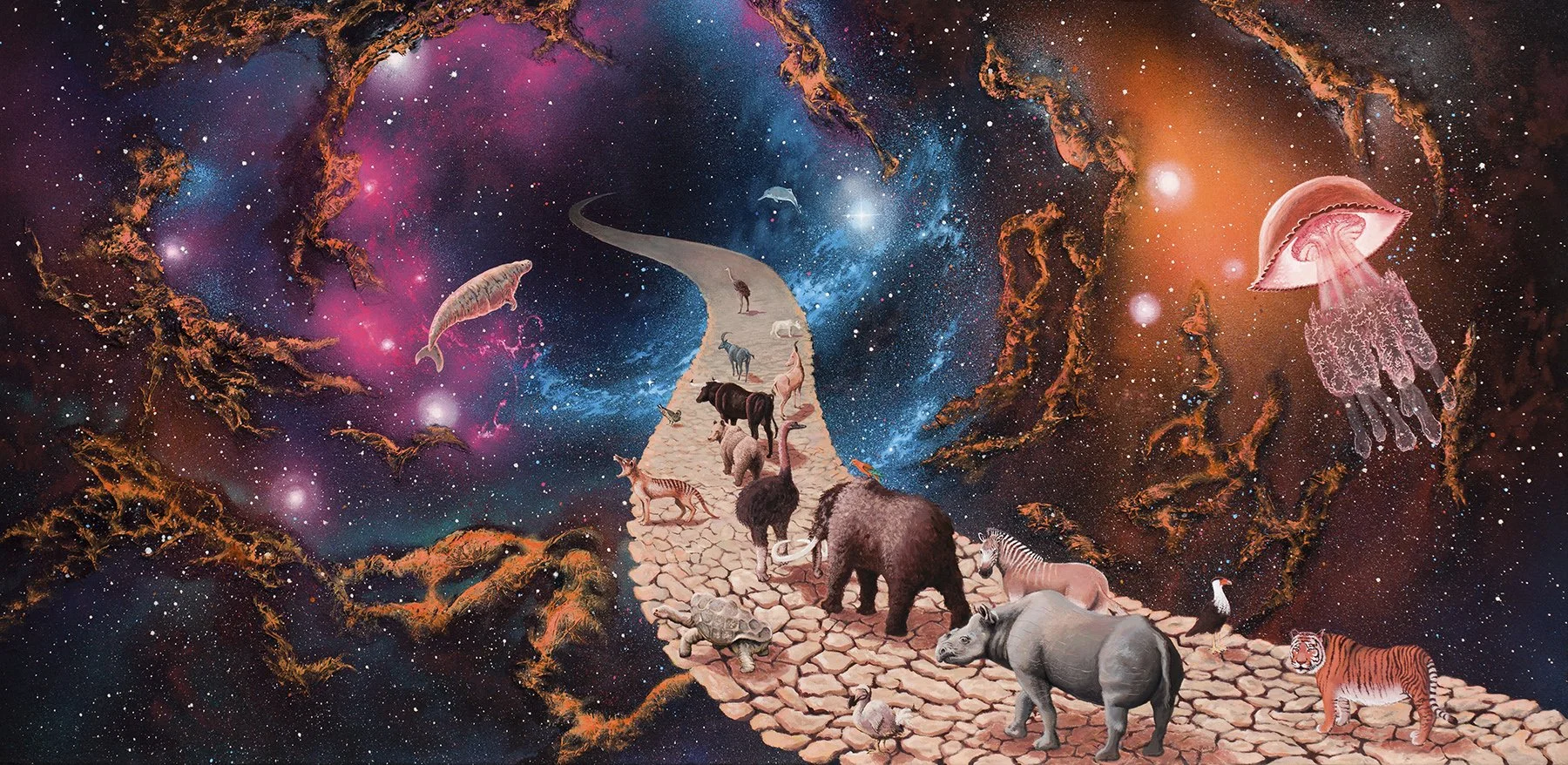 The series of works speculates how future humans would create robot animals with the aim to repair the broken ecosystems around the world. Some depict the environments where the animals originally lived before human intervention. The animal machines have already been ravaged by time, and some of them have fallen into disrepair. Some have still managed to restore nature. Some of the animal machines have drifted into space, creating a backdrop for the eternal loss that threatens us, too, if we do not take care of our planet.