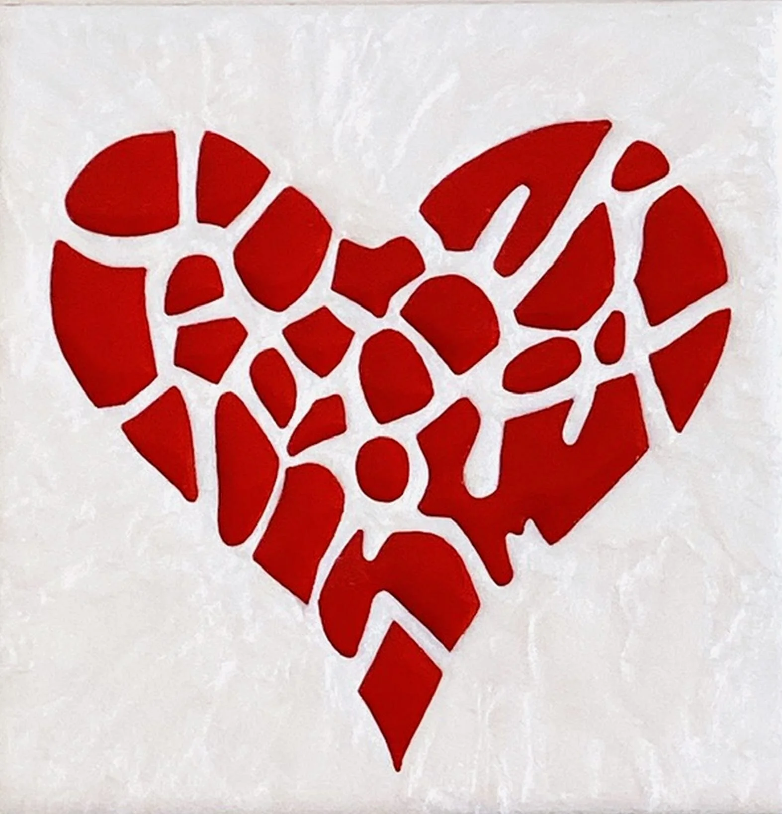 In Broken Heart, Cardinali confronts the theme of emotional vulnerability. The fractured red heart design etched into the white ceramic tile is a visual metaphor for the universal experience of love and loss. Rather than portraying despair, however, Cardinali imbues the piece with an underlying sense of hope. The heart’s fractured segments suggest that while broken, it remains whole—strong and vibrant in its essence.