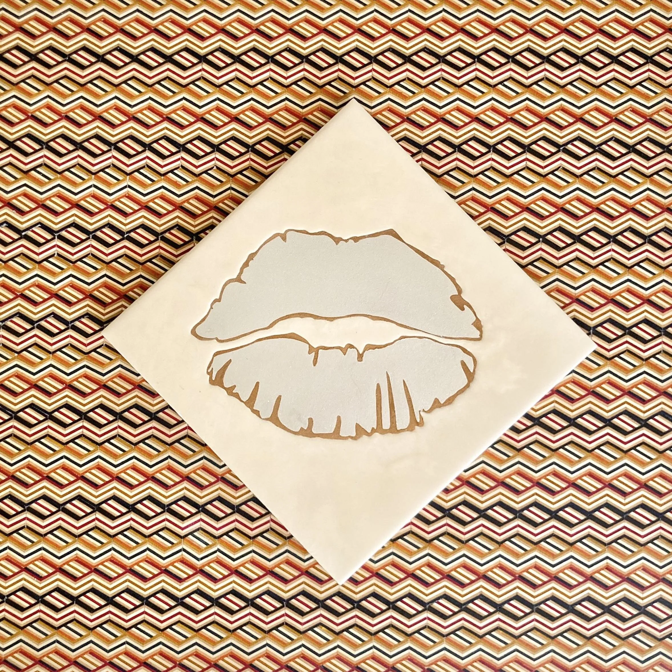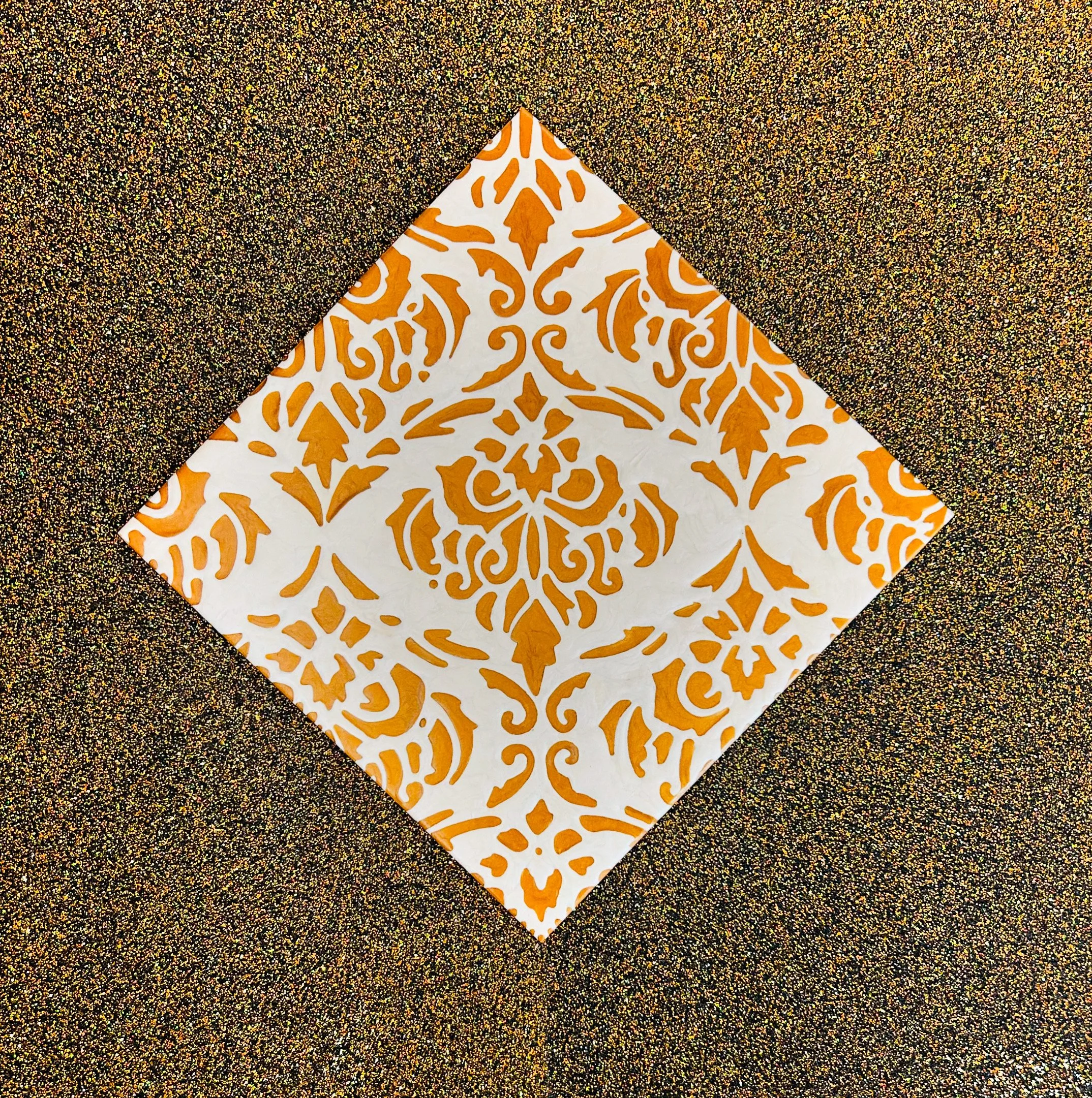 The Louvre tile is a remarkable example of Cardinali’s ability to integrate historical aesthetics into her work. Drawing inspiration from traditional damask patterns, this piece combines intricate gold motifs with her signature ceramic medium. The result is a work that bridges the gap between classical refinement and modern minimalism.