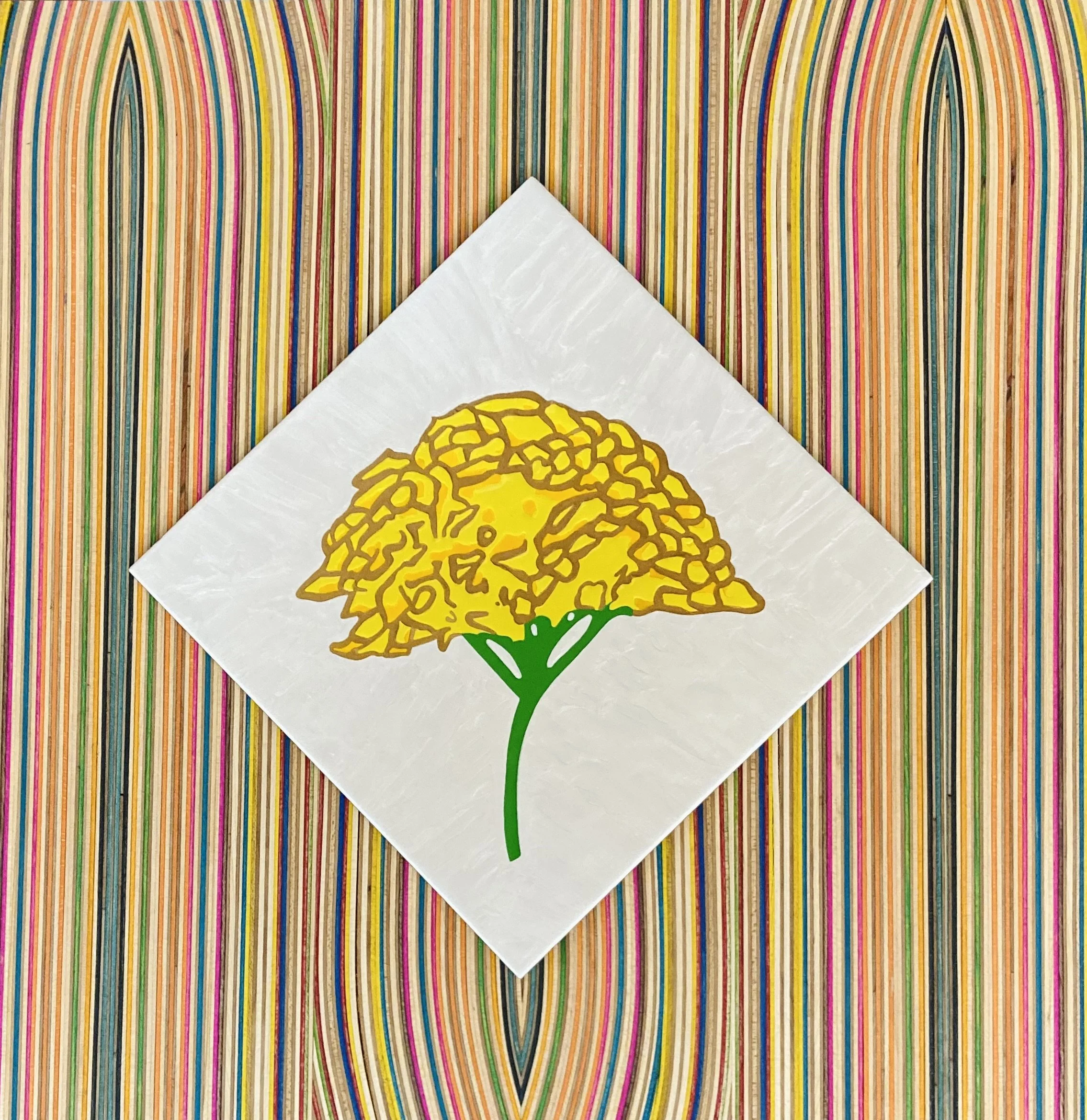 The simplicity of the flower’s depiction is balanced by the subtle texture of the ceramic surface, creating a piece that is both delicate and powerful. The vibrant yellow contrasts with the tile’s muted background, emphasizing the flower’s symbolic strength and its ability to thrive in harsh conditions.