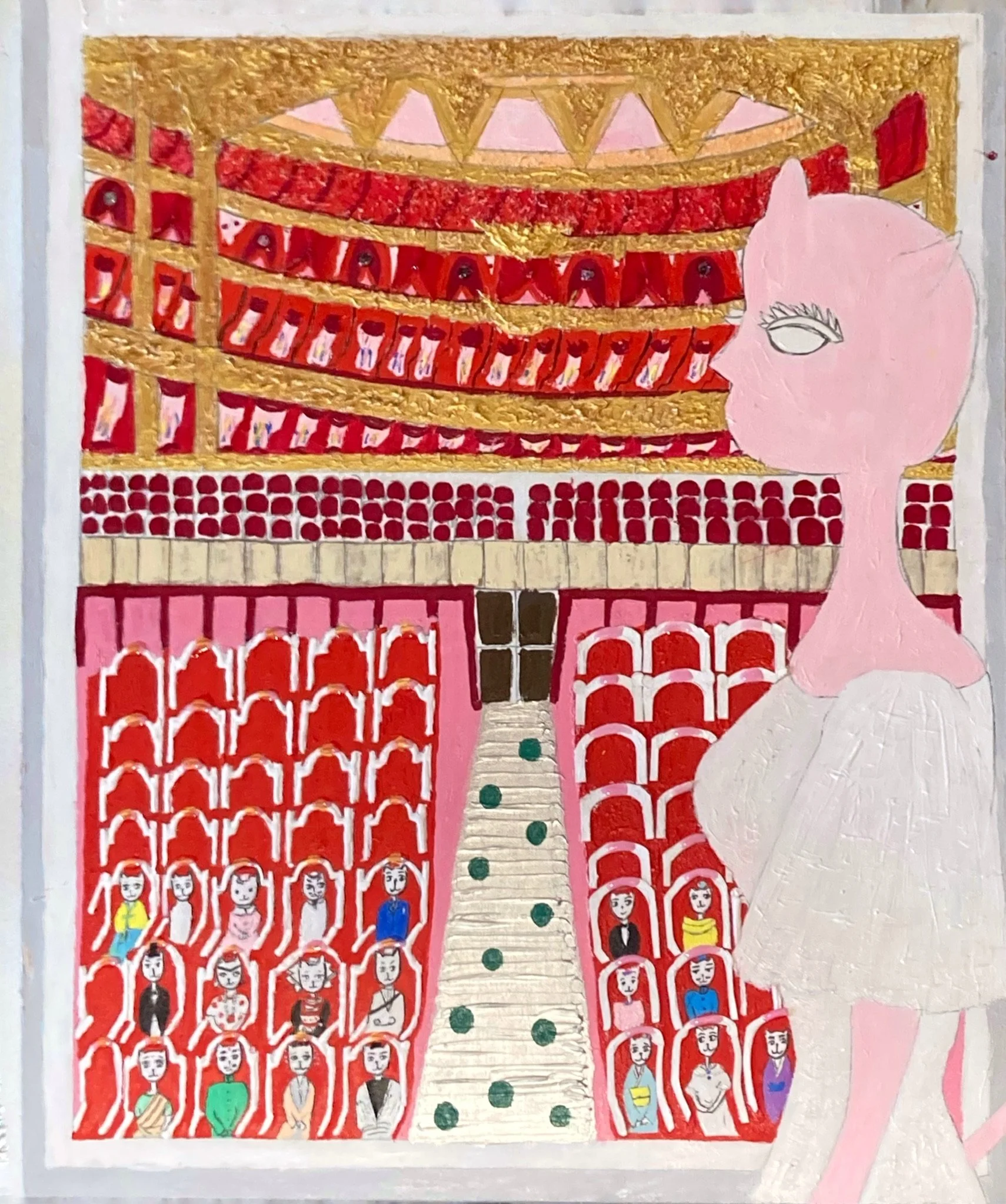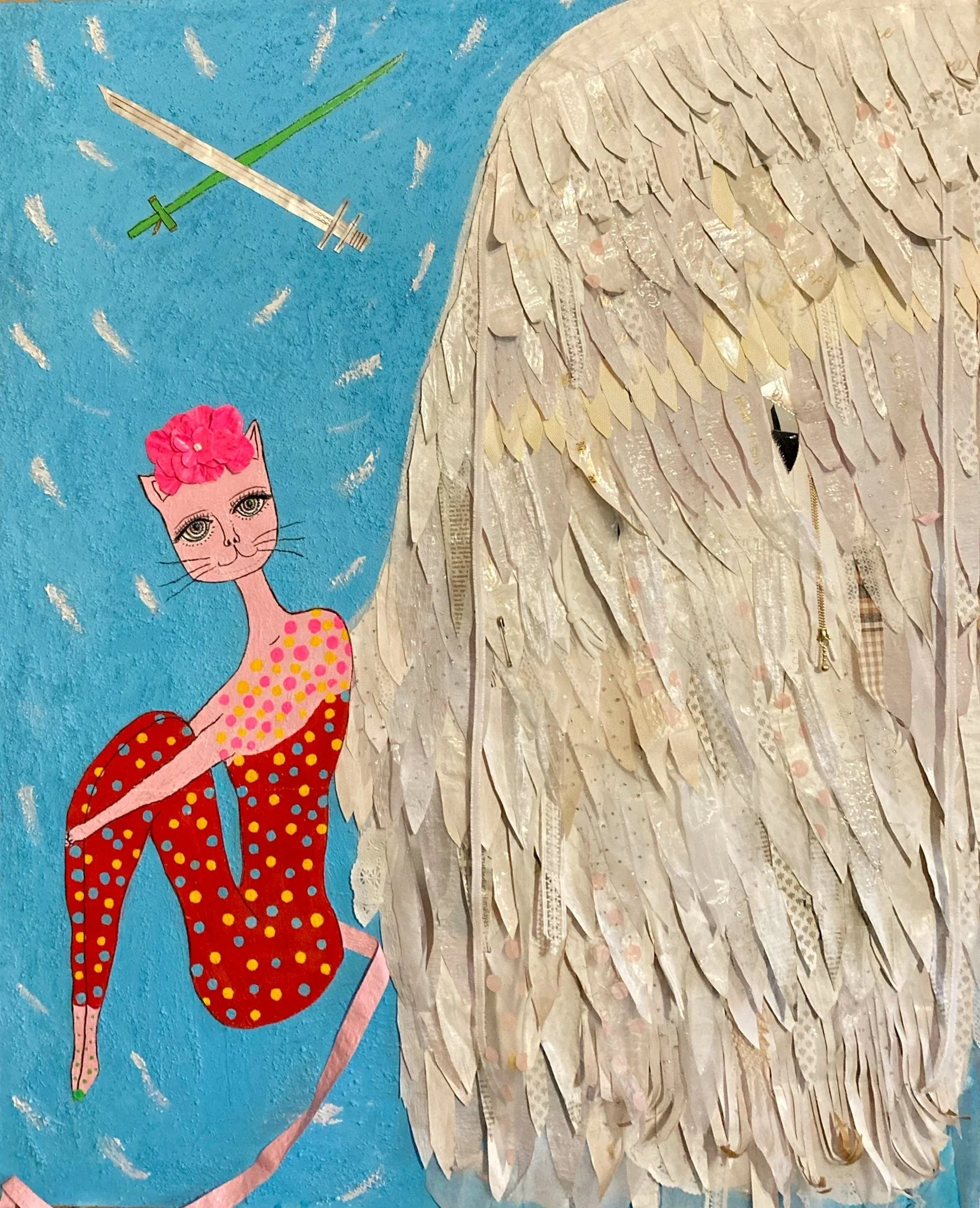 In her creative process, after sketching, she uses a brush pen to draw the main lines and then breathes life into the work with acrylic gouache. To add richness and depth, she uses various media and materials to enhance the expression of her artwork.