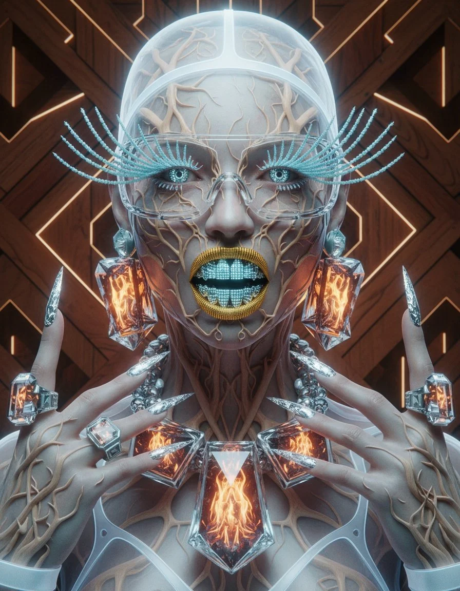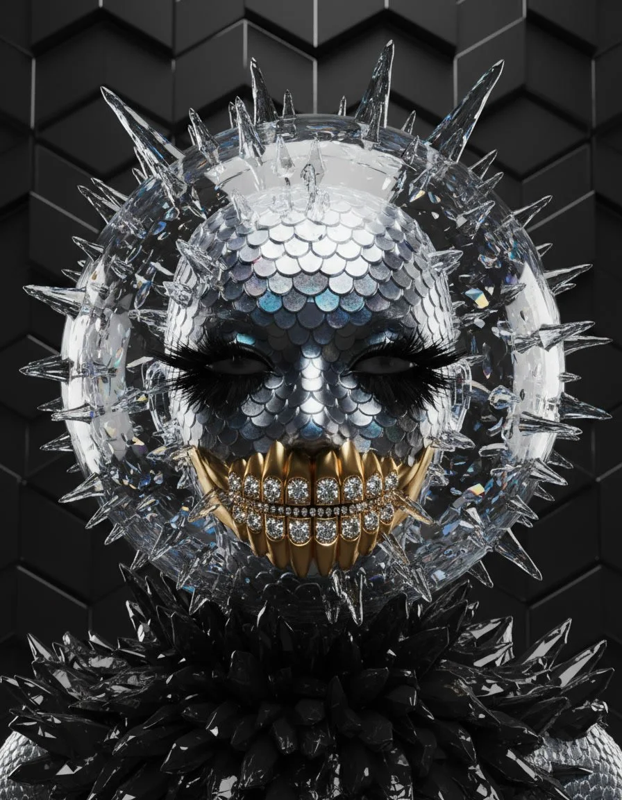 I see the human face as the ultimate architecture. By encrusting it with diamond-pavé zipper grids or electrified crystal shards, I am turning the face into a 'high-fashion' site of transformation. My process for refining AI outputs involves 'digital polishing'—directing the tool to achieve a precise finish that mimics the way a jeweler would hand-set a stone into a gold mount. Every pixel must have the same intentionality as a hand-cut gem.8. On Brand Duality: