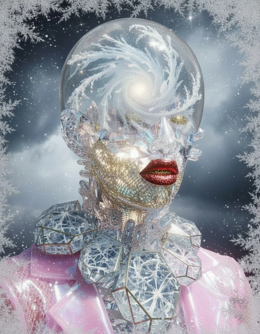 The imagery in your new 2026 series often features faces encrusted with grids, pearls, diamonds, or crystalline structures. How do you see the human face functioning in your exploration of high-fashion surrealism, and what is your process for refining AI outputs to achieve such a precise, "haute couture" finish?