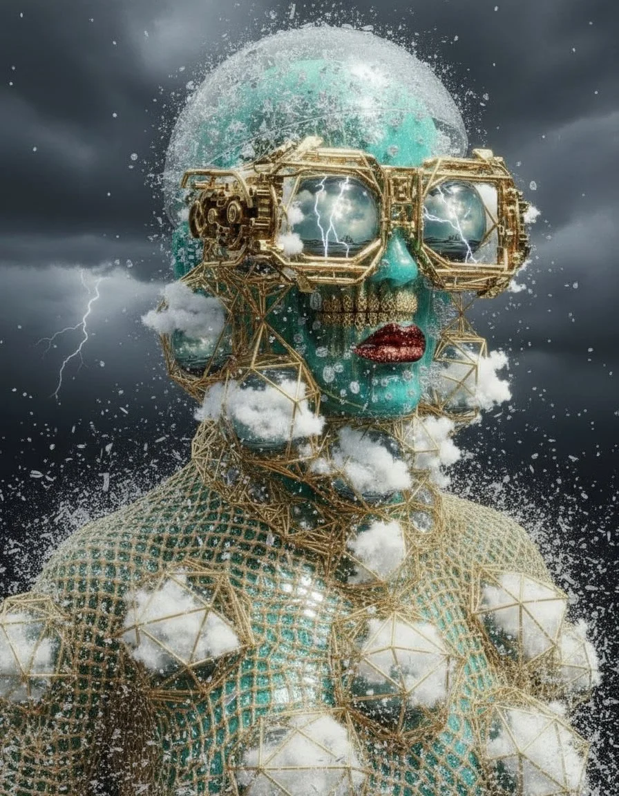 When moving into themes like Riders on the Storm and Krystalline Kode, I use opulence as a protective layer. The boundary between my personal narrative and universal symbolism is found in the storm-filled eyes and edgy glass headpieces. AI mediates this by allowing me to 'set' clouds and lightning into intricate mounts, expanding the story from a personal breakthrough to a universal symbol of mental resilience. It allows me to build a mythology where human struggle is transformed into a masterpiece.