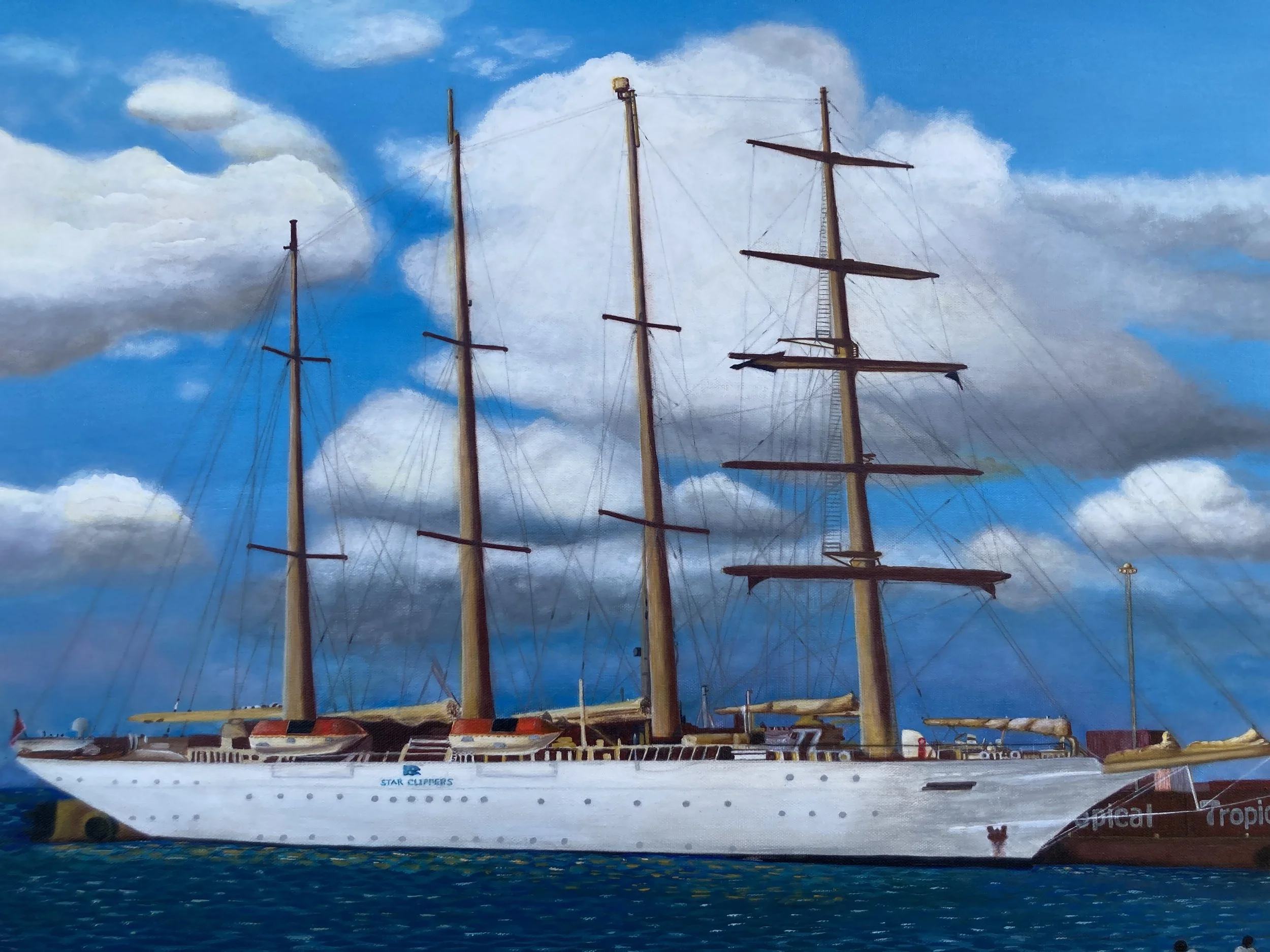 The Star Flyer Star Clippers Tall Ship in Grand Cayman; 2020. Acrylic on canvas, 61x91cm.