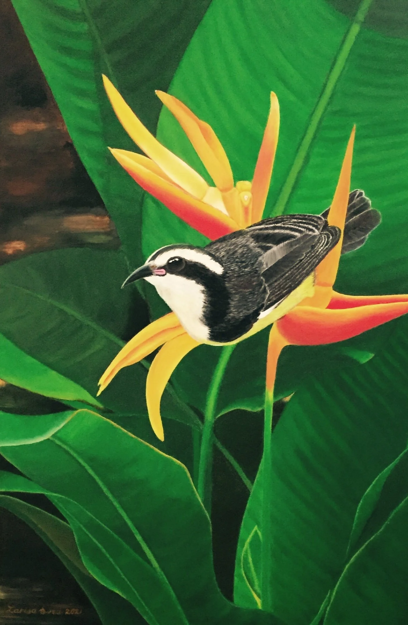 Perfect Perch. Cayman Bananaquit on the Heliconia Golden Torch; 2021. Acrylic on canvas, 91x61cm.