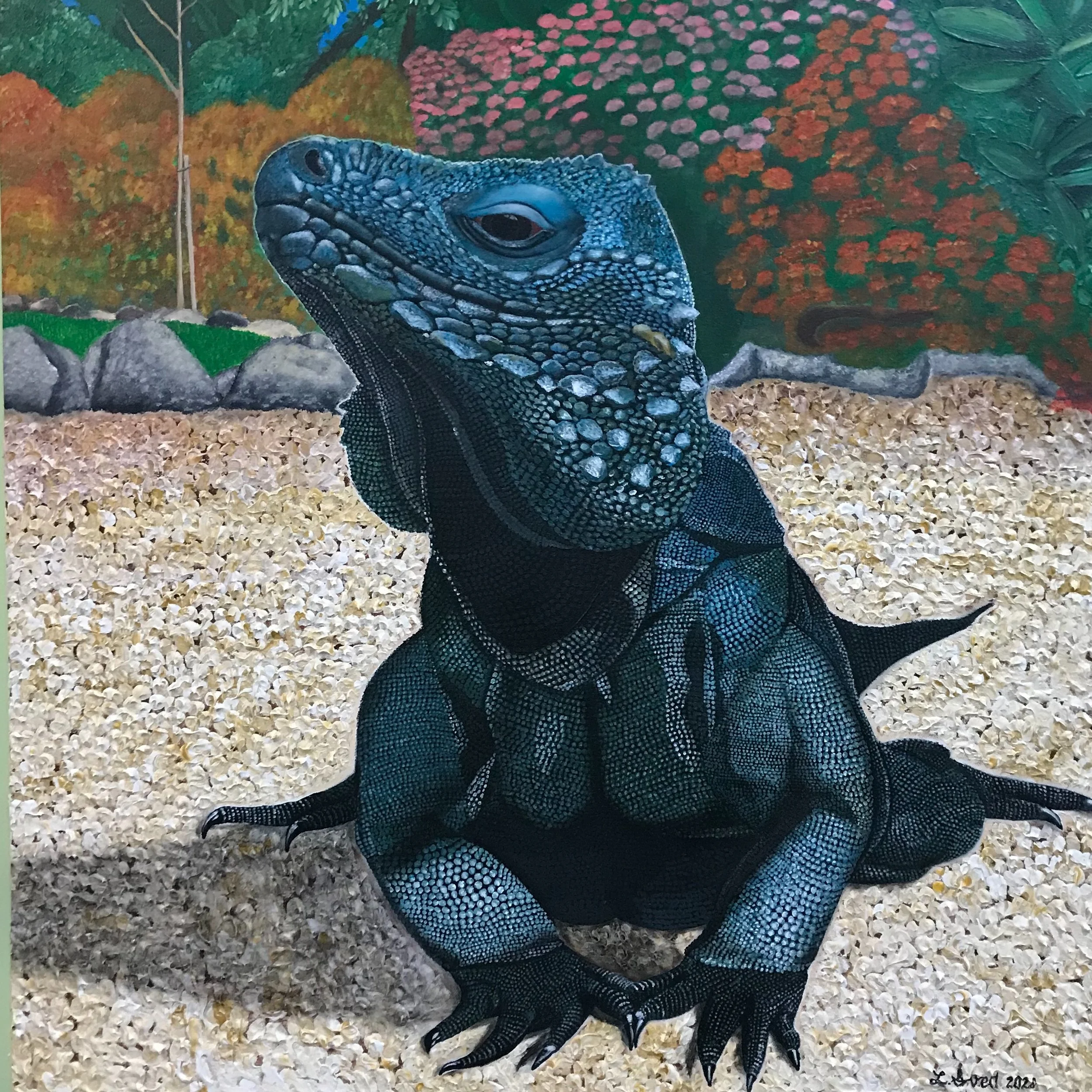 Majestic. The Blue Iguana of the Cayman Islands, HM Queen Elizabeth II Botanic Park; 2020. Acrylic on canvas, 76x76cm.