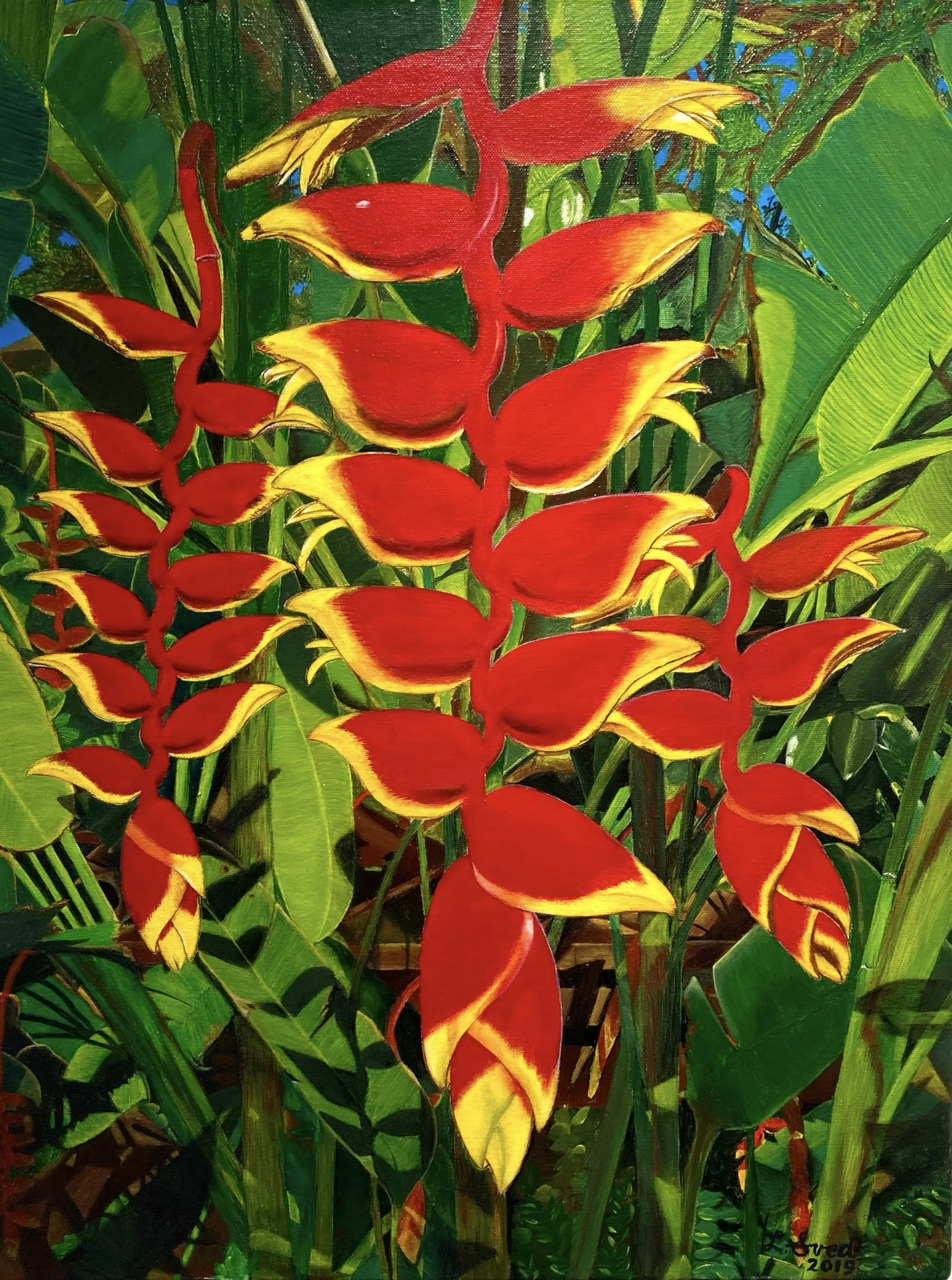 Heliconia Lobster Claw Plant in Grand Cayman, 2019. Acrylic on canvas, 61x46cm.